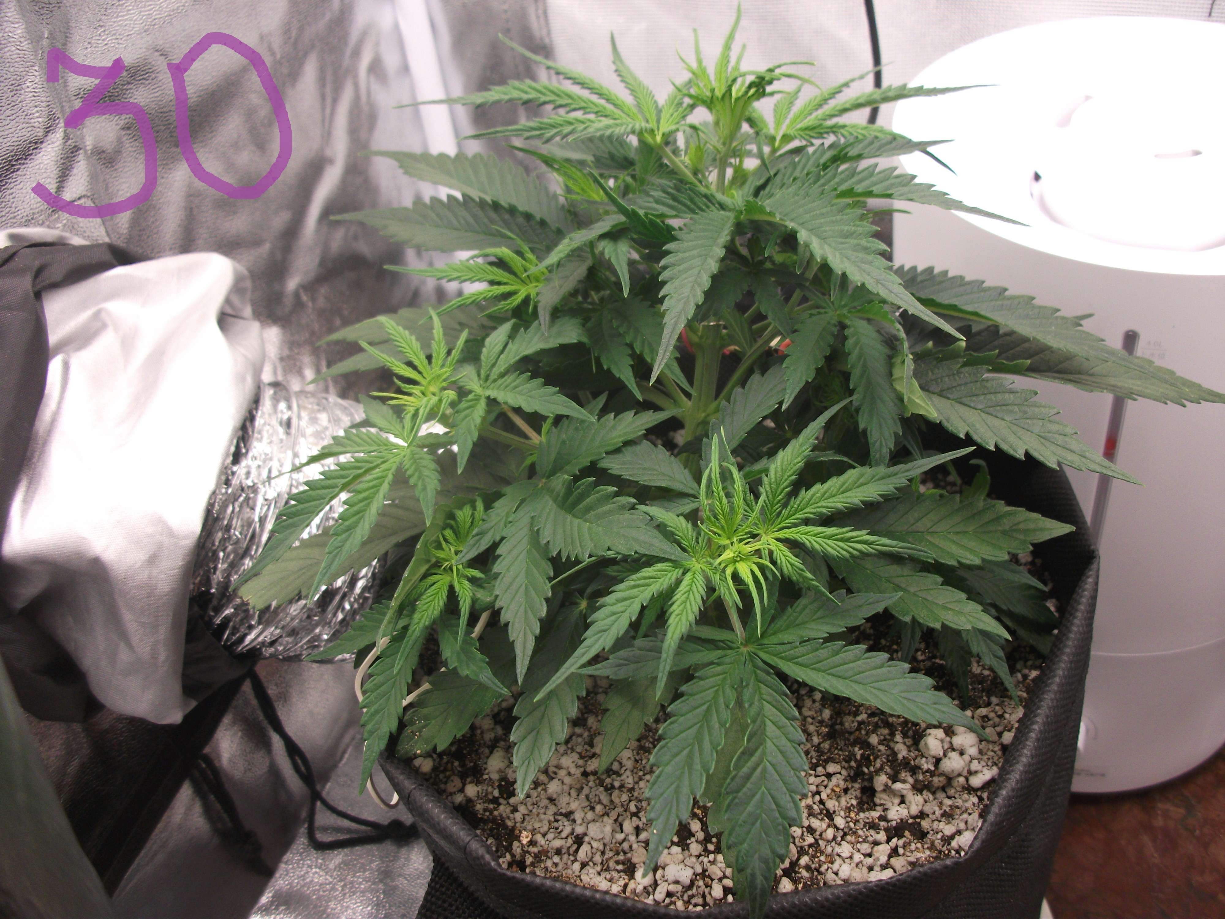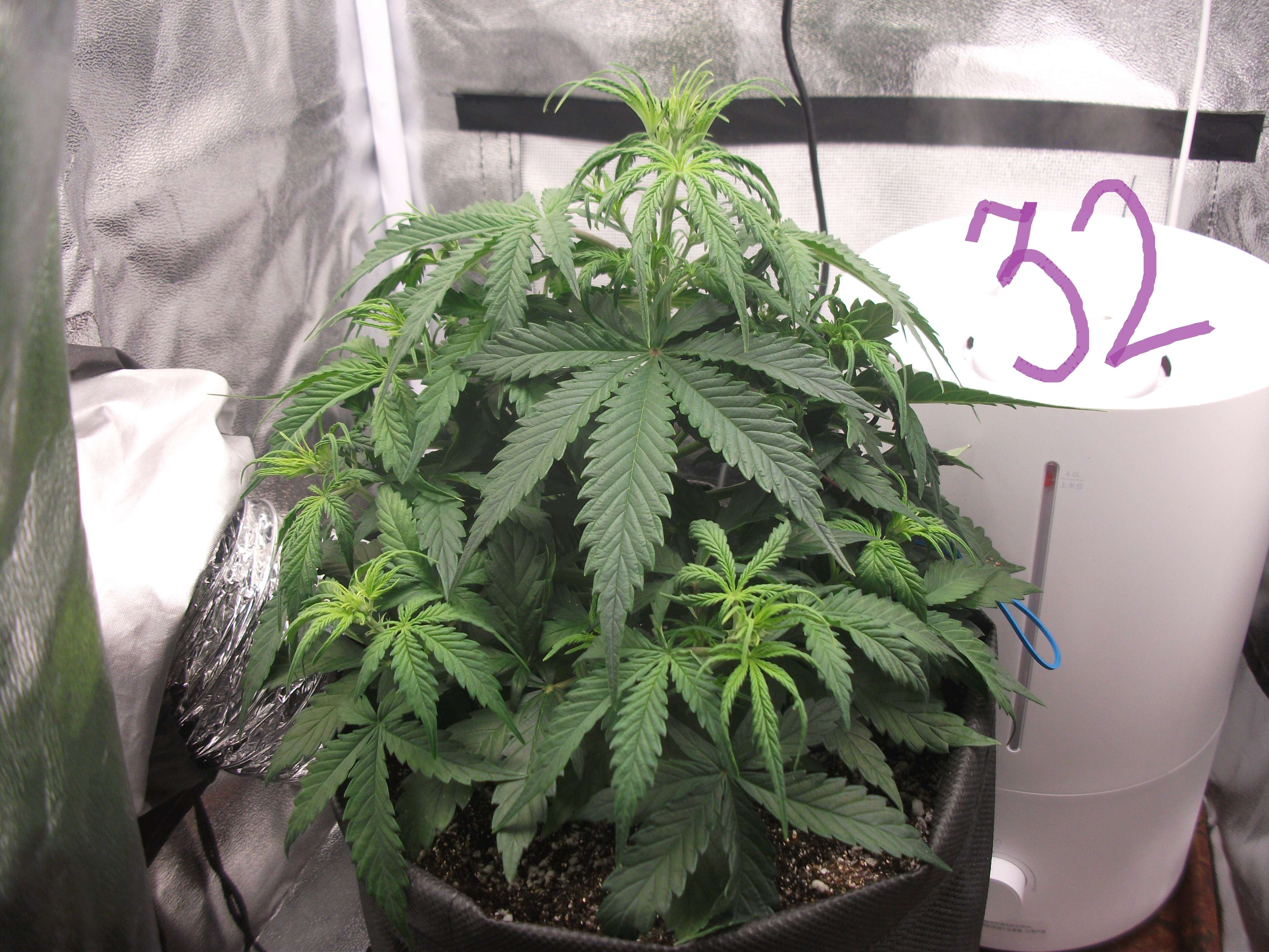 День 33. Температура 26, влажность 60 ровно. Долго гонял - резать/не резать, в итоге решил опираться на опыт старших до конца, чикнул 4 нижних лопуха и один центровой, из-за которого весь кипишь и затевался + вынес попить, дал недолитый позавчера литр, но не компота, а воды с каплей HB101 и 1.5 CalMag, ph ровнял Ломоносовым 3 капли с 6,86 до 6,5-6,41/ 328ppm.
