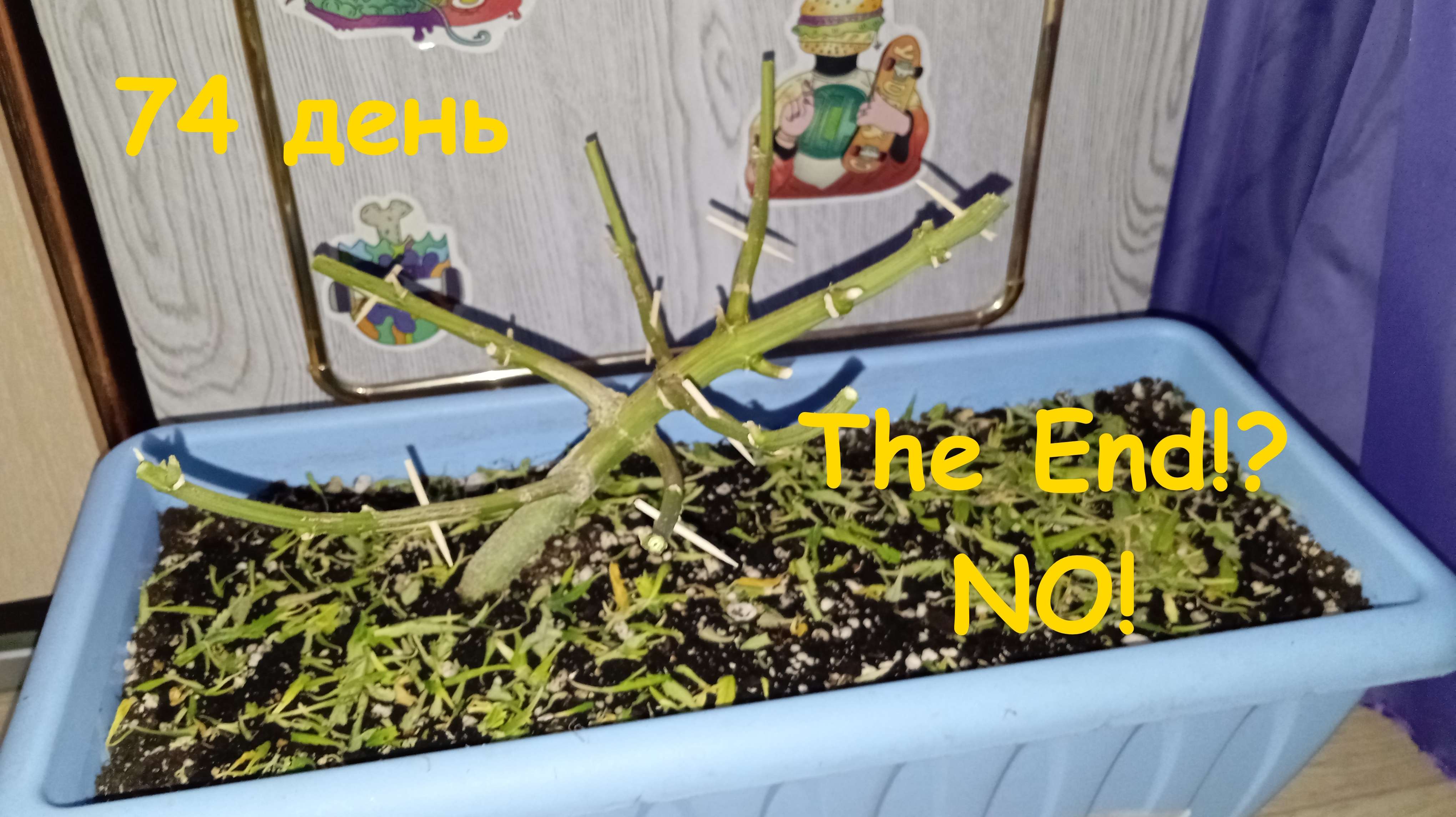 Через подсушку горшка до 4х дней, и последующим поливом 1 литром воды с мёдом на 72 дне, на 73 день растиха опять поехала в ночь на 12 часов в холод 10С.