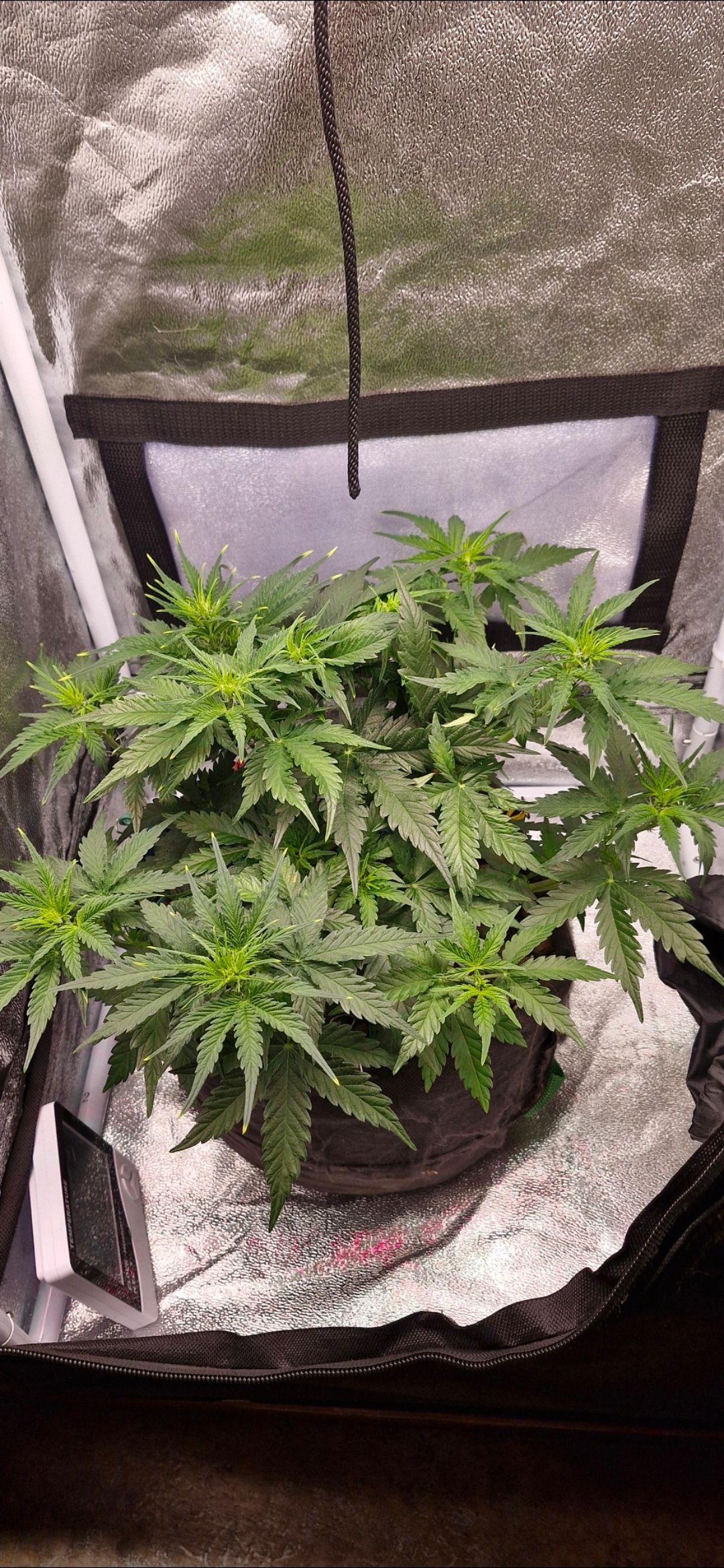 1) Полив сначала водичкой 500мл, чтобы минимизировать ожоги, потом следом с удобрениями, по табличке для вспышки роста(цветение) даю 1/4 дозировки, плюс бустеры и фульвокислоты. Фотографии будут позже т.к. заполняю заранее всё. Подрасстянул ещё чуток. У нас ещё предцвет. Думаю недельку полторы ещё будет точно. Фото прилагаю. Соединил две лампы в одну. Жарят 50к lum но как показал прошлый гров это не так уж и страшно. Понаблюдаю ещё завтра посмотрю на предмет передозировки, и световых ожогов. 2)Сегодня глянул на предмет скрутки и ожогов листьев. Всё очень хорошо. Ничего не растягивал уже некуда тянуть. Думаю через полторы недели зацветём, и тогда сниму резинки. Интересно сколько на цвете наберёт роста.