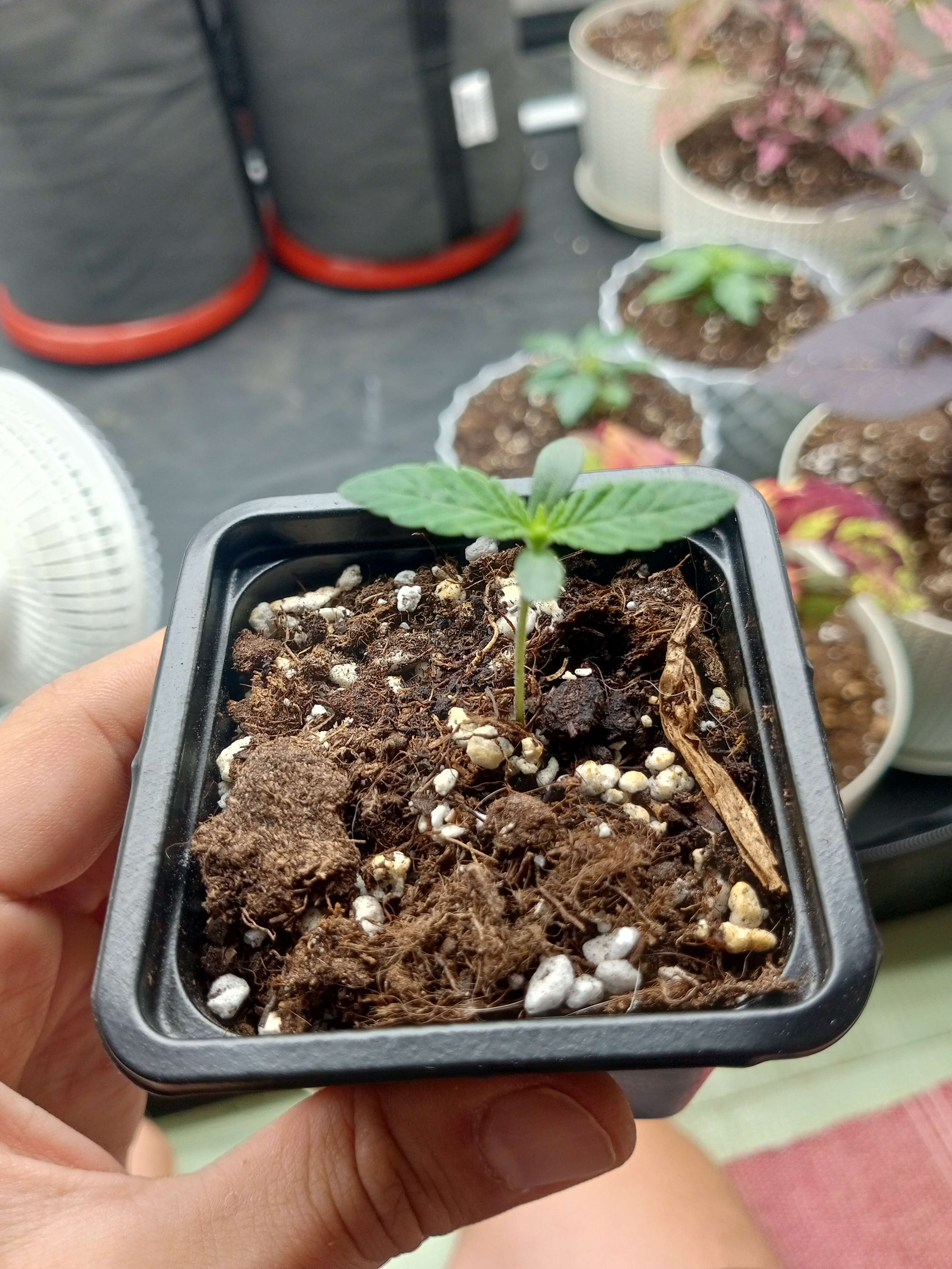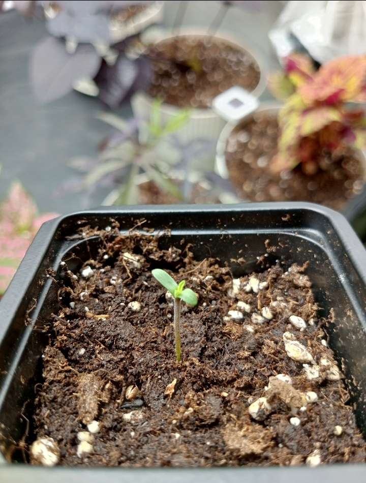 Растет, тянется. Как по мне, тянется слишком сильно. Переставил повыше. В целом, выглядит хорошо. Выпустила вторую пару листьев. Пока без полива - нет необходимости.