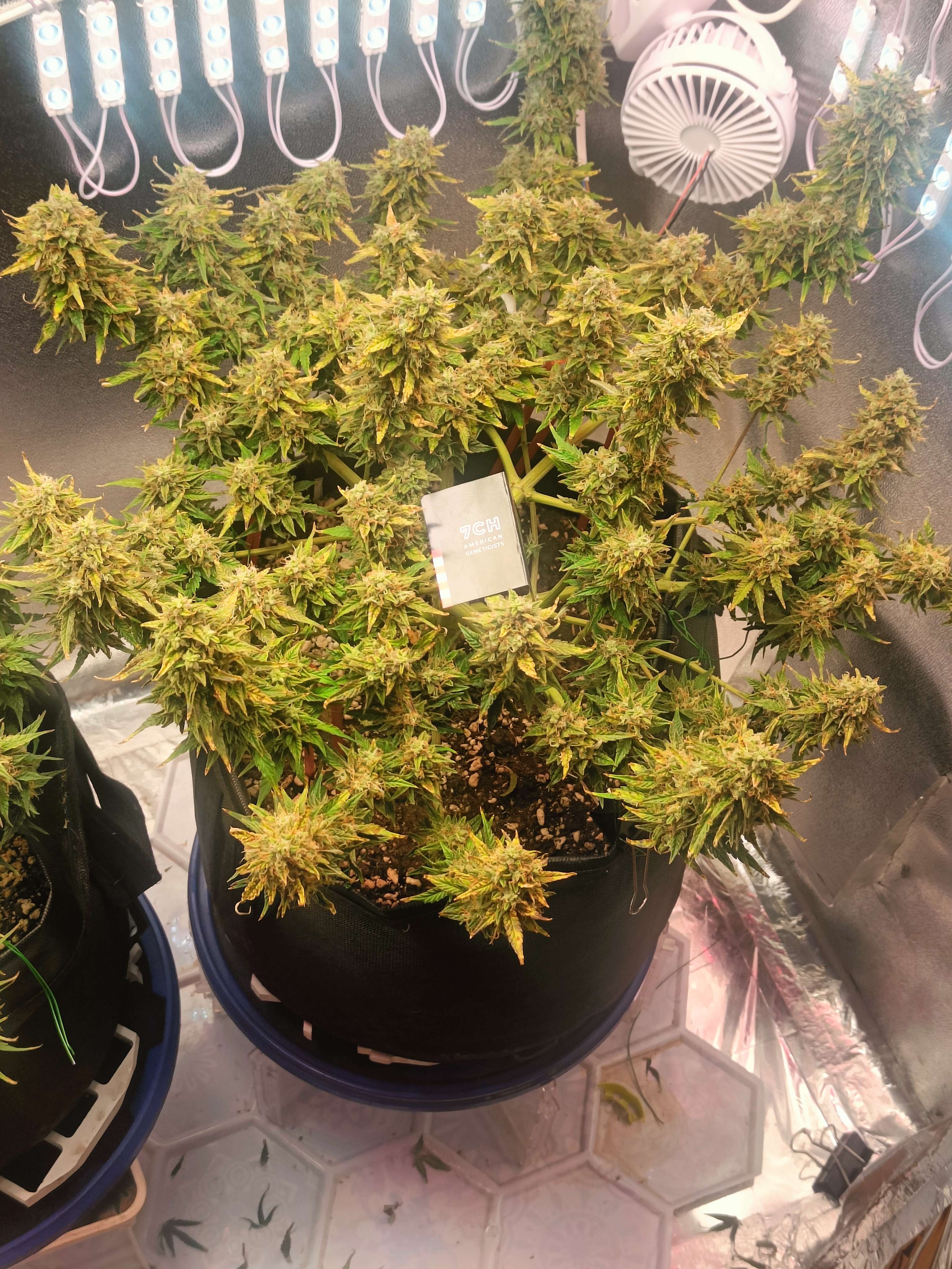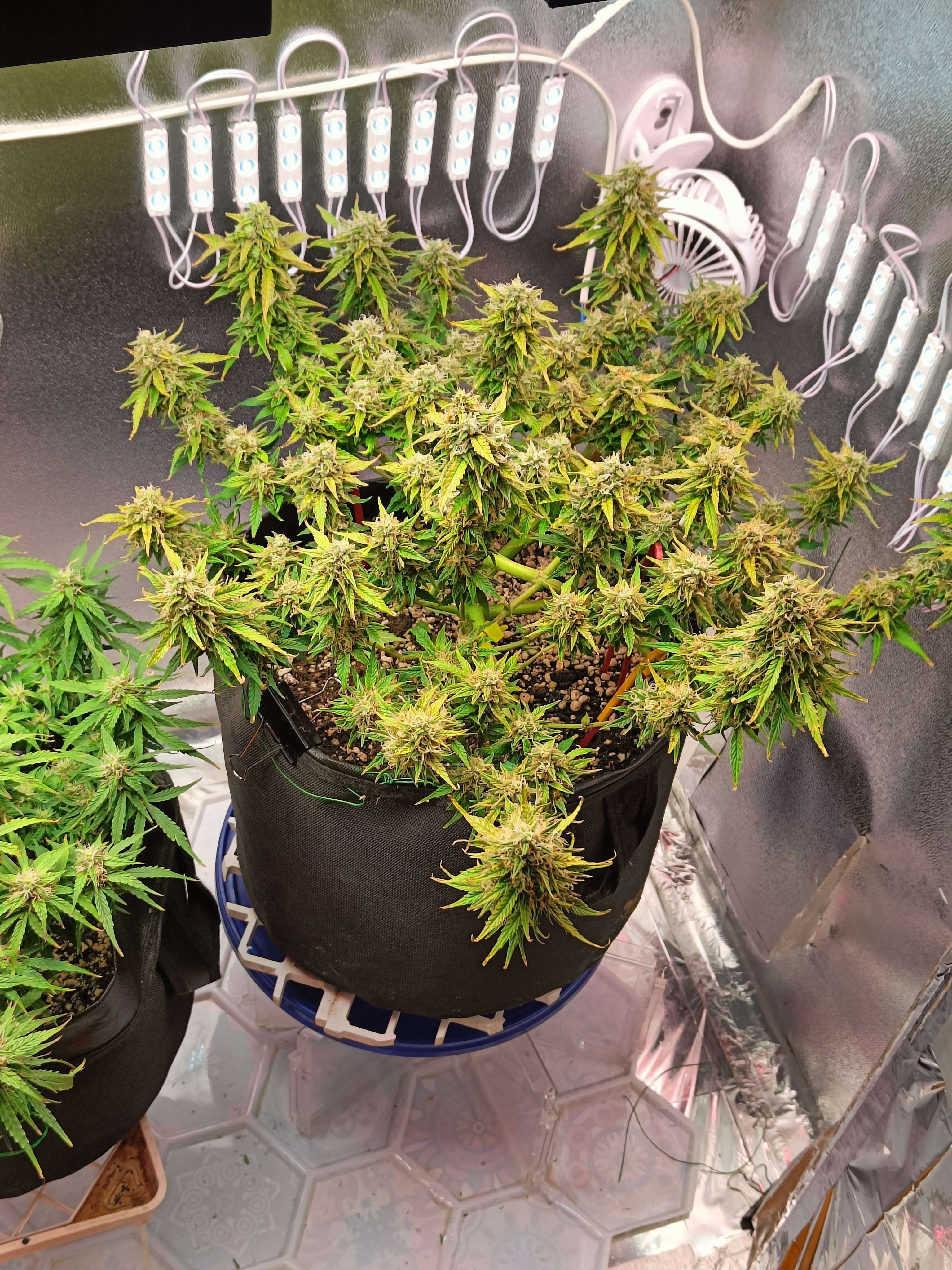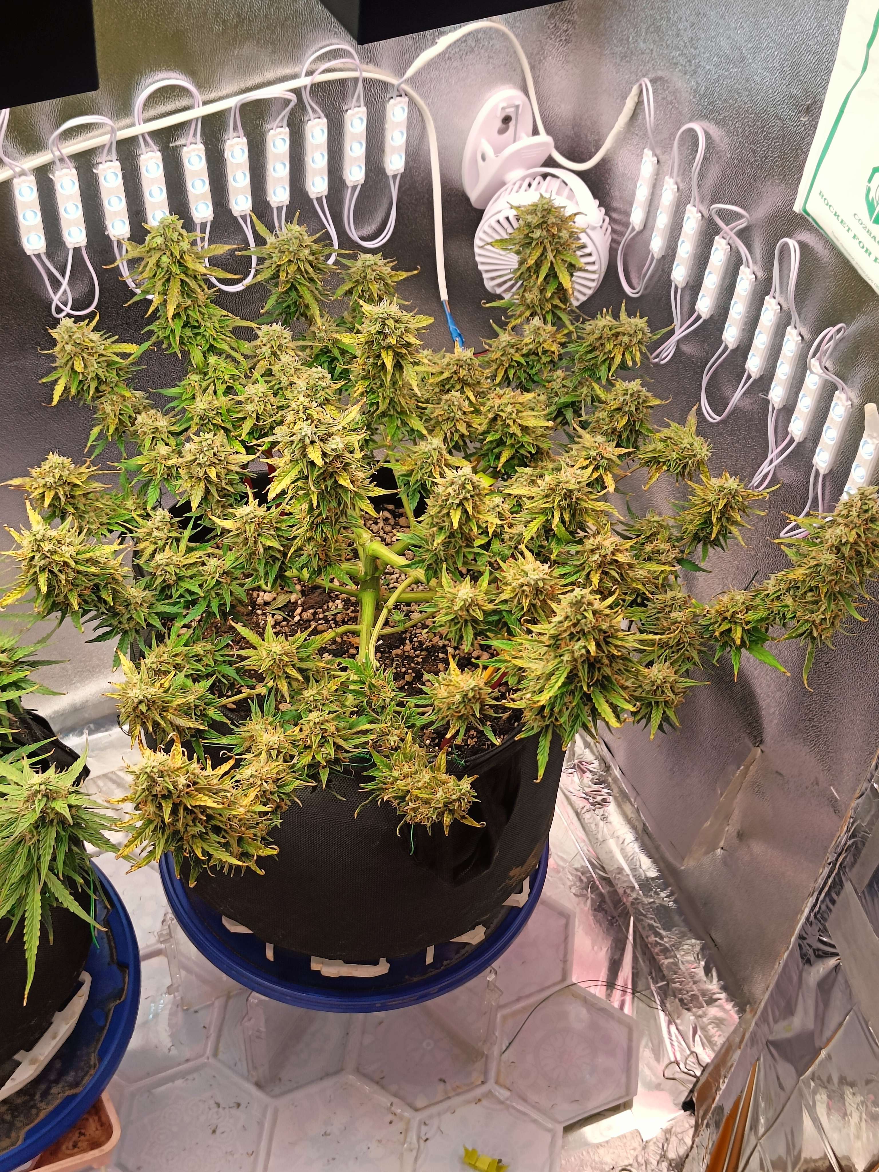 64 День ) А решил я значит сделать Бэкбилдинг, отрезал по 3/5/10/15 мм от верха, на каждую ветку повесил бирки , посмотрим результат , рядом сними на переднем плане примерно одинаковые по размеру соцветия, будем сравнивать с ними