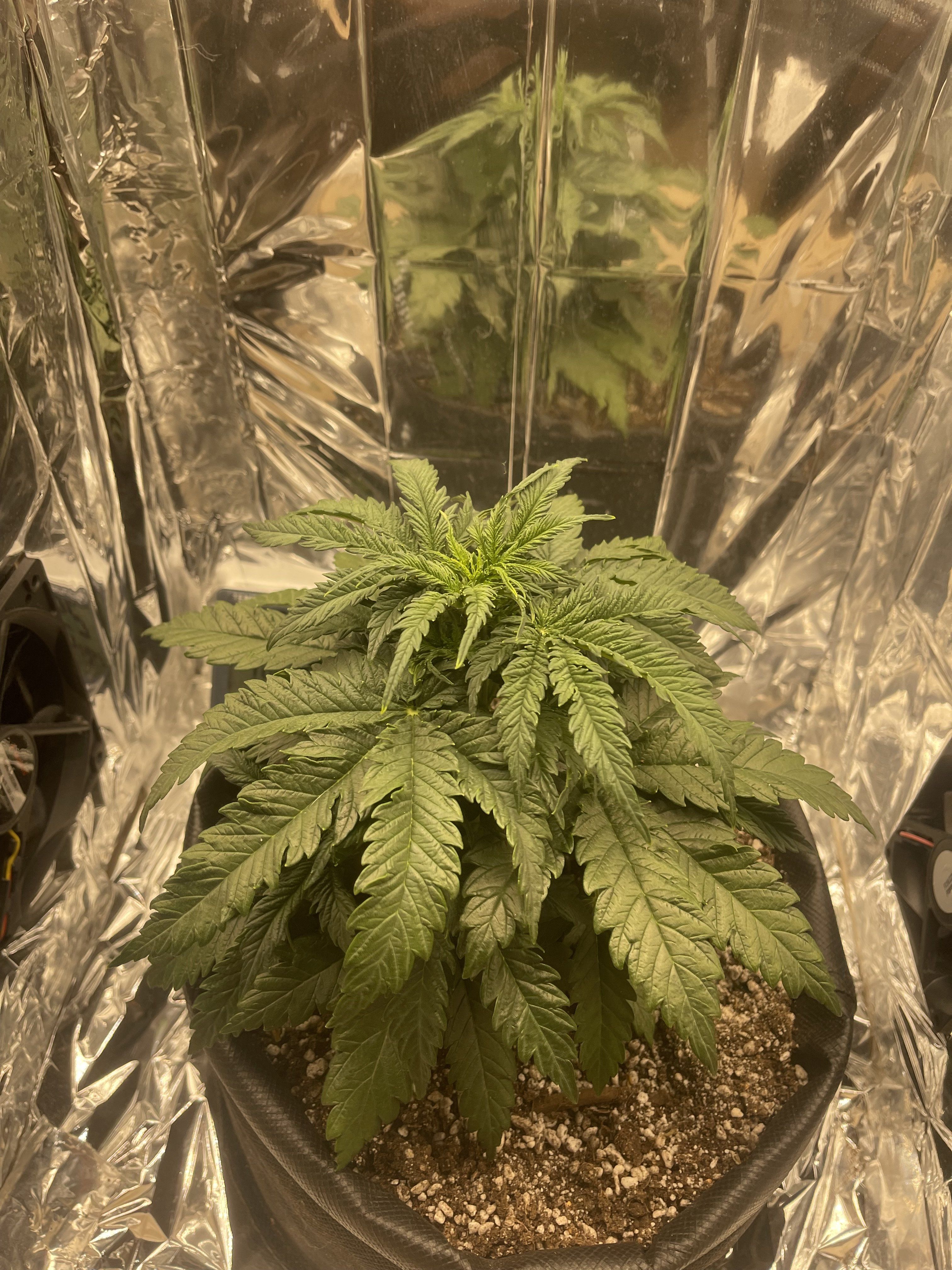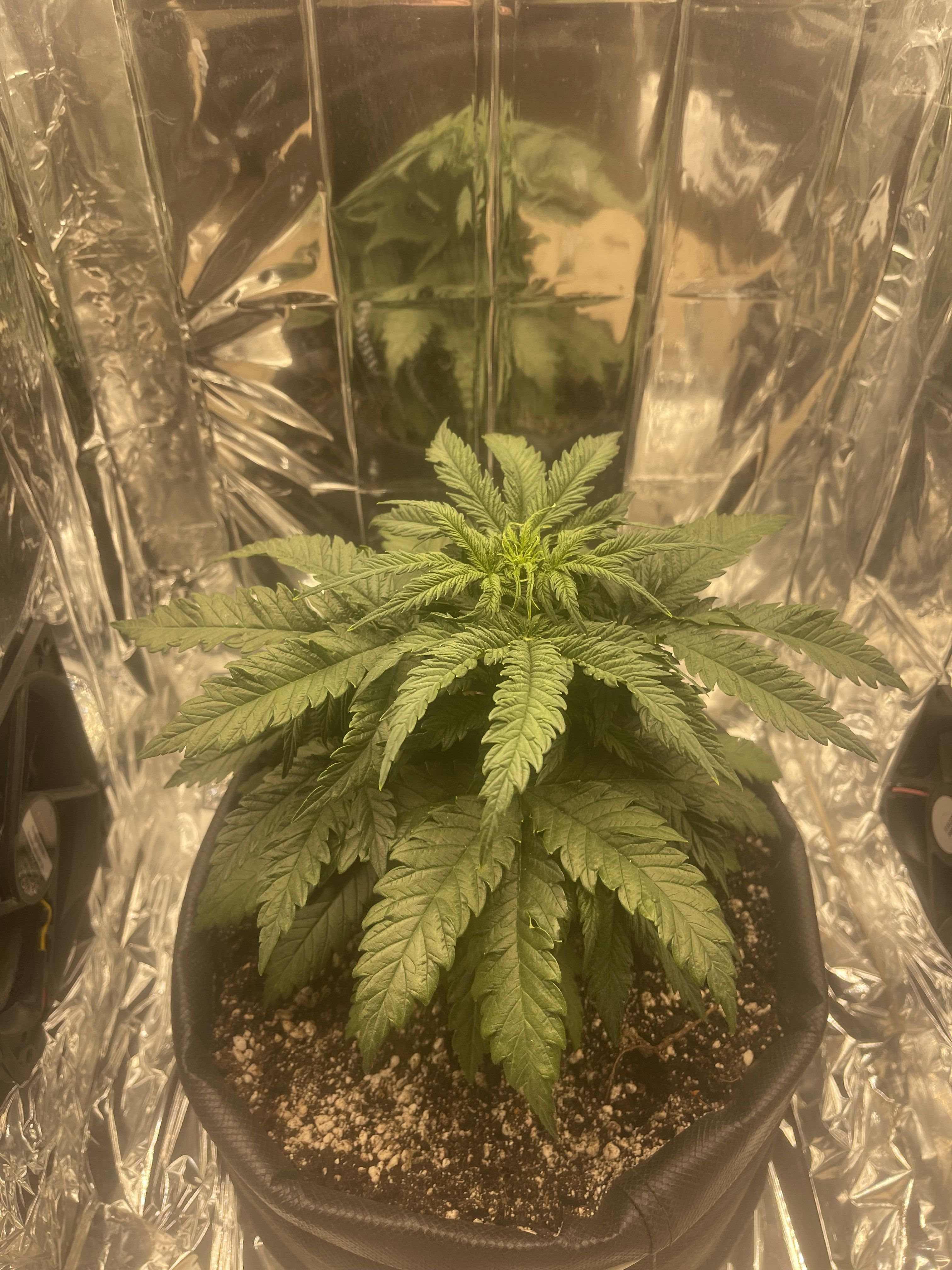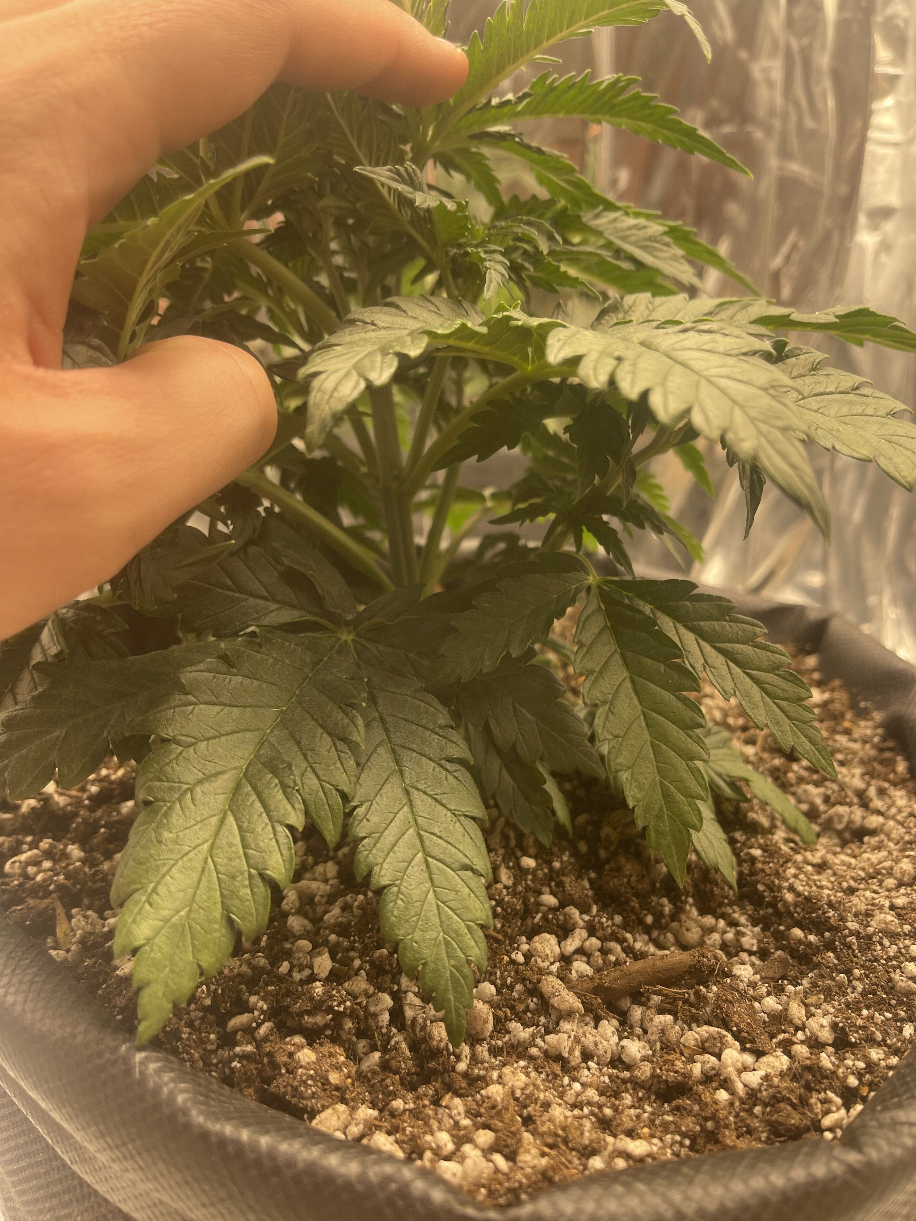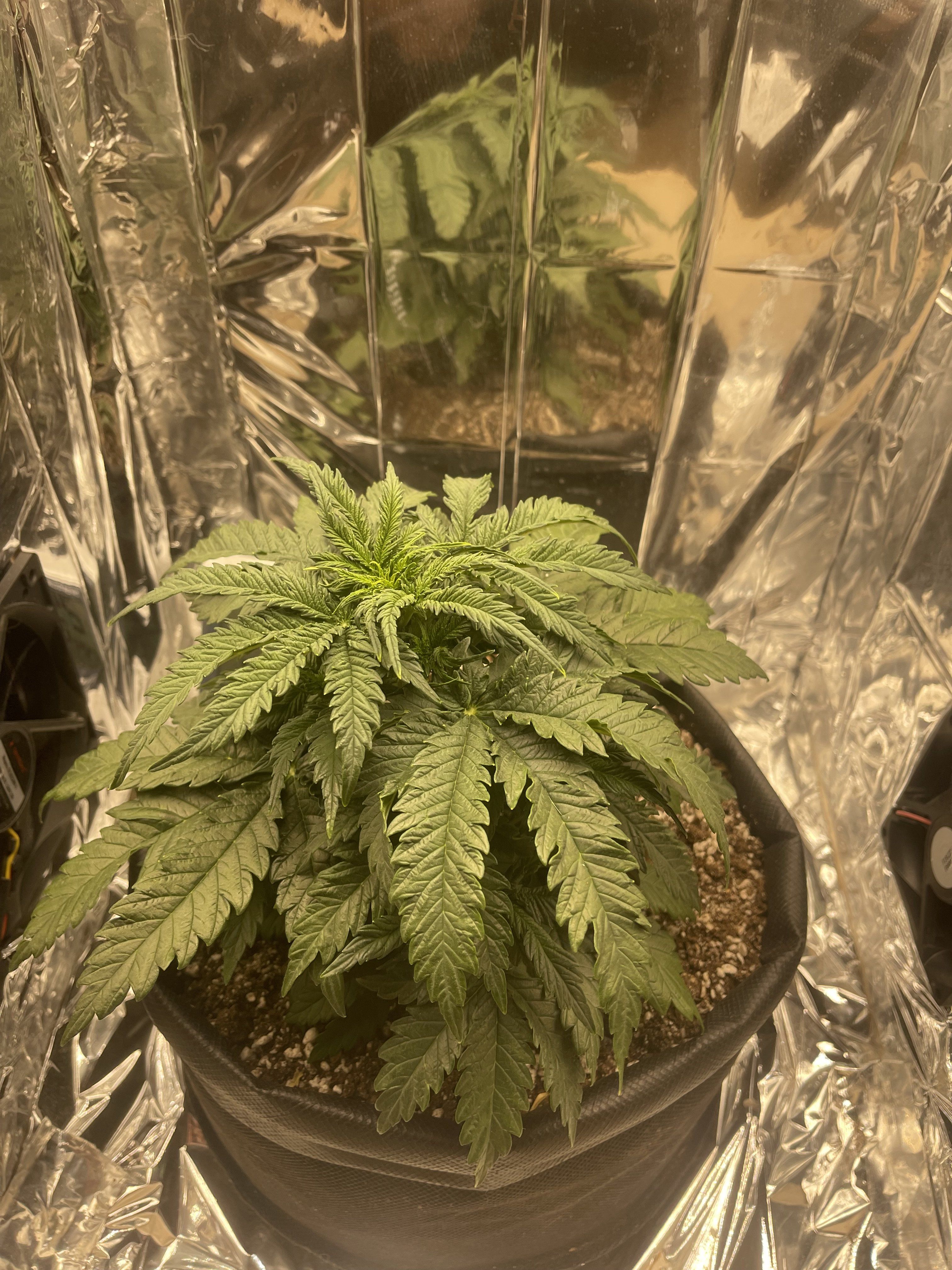 И убирай фольгу. Она тебе пожжет листья. Либо пенофол приделать либо белой краской покрась. У тебя сейчас света по идее даётся 50% от максимума и уже растишке не очень комфортно от недостатка кальция,избытка азота и судя по всему ещё и слишком жарко в боксе.А когда все 100% света дашь,листьями хана