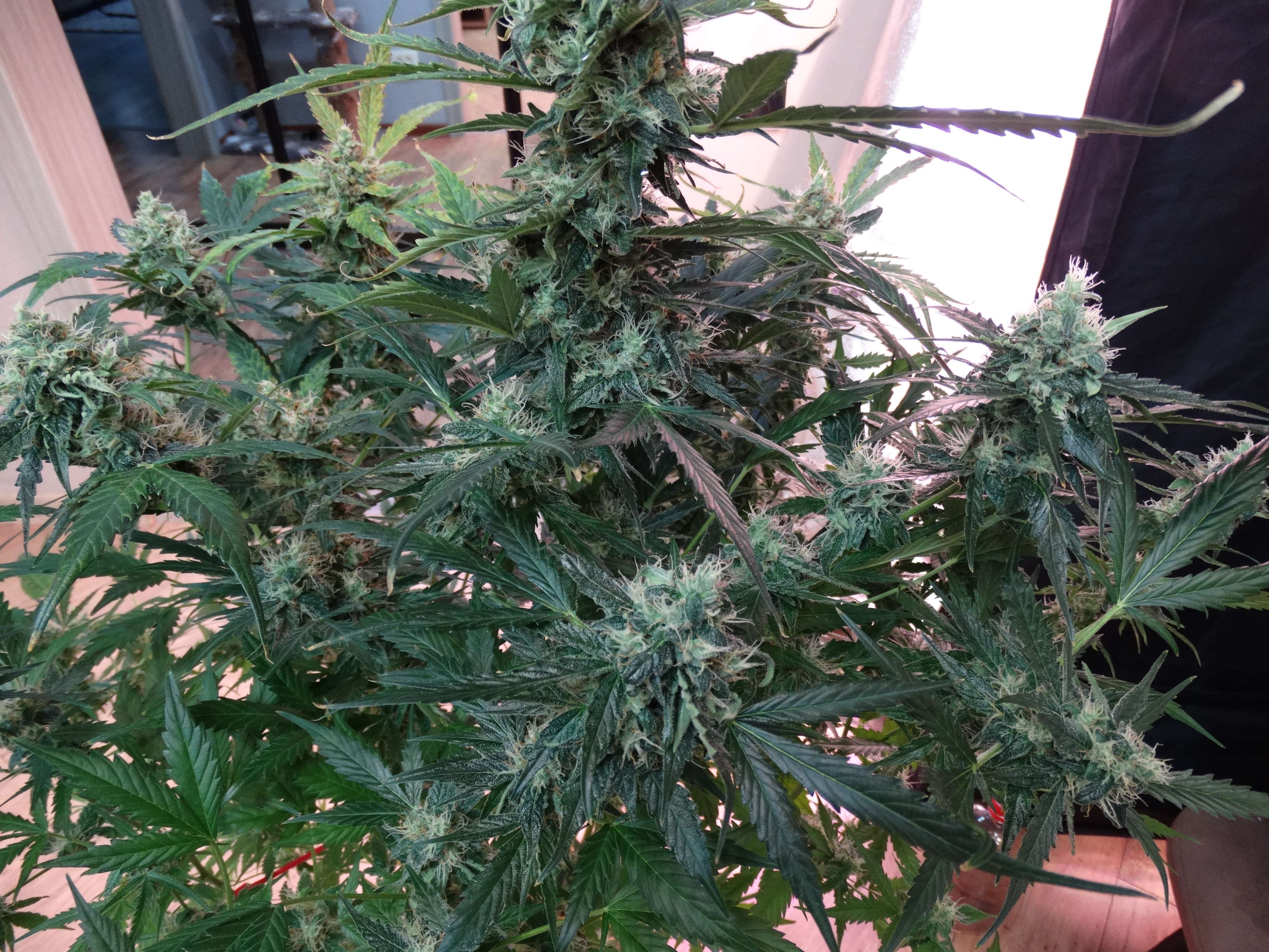 Трихомы стали янтарными, на сколько смог разглядеть, запах очень сильный. Планирую завтра срезать, ну а сегодня выключил свет и добавил лед в прикорневую зону.