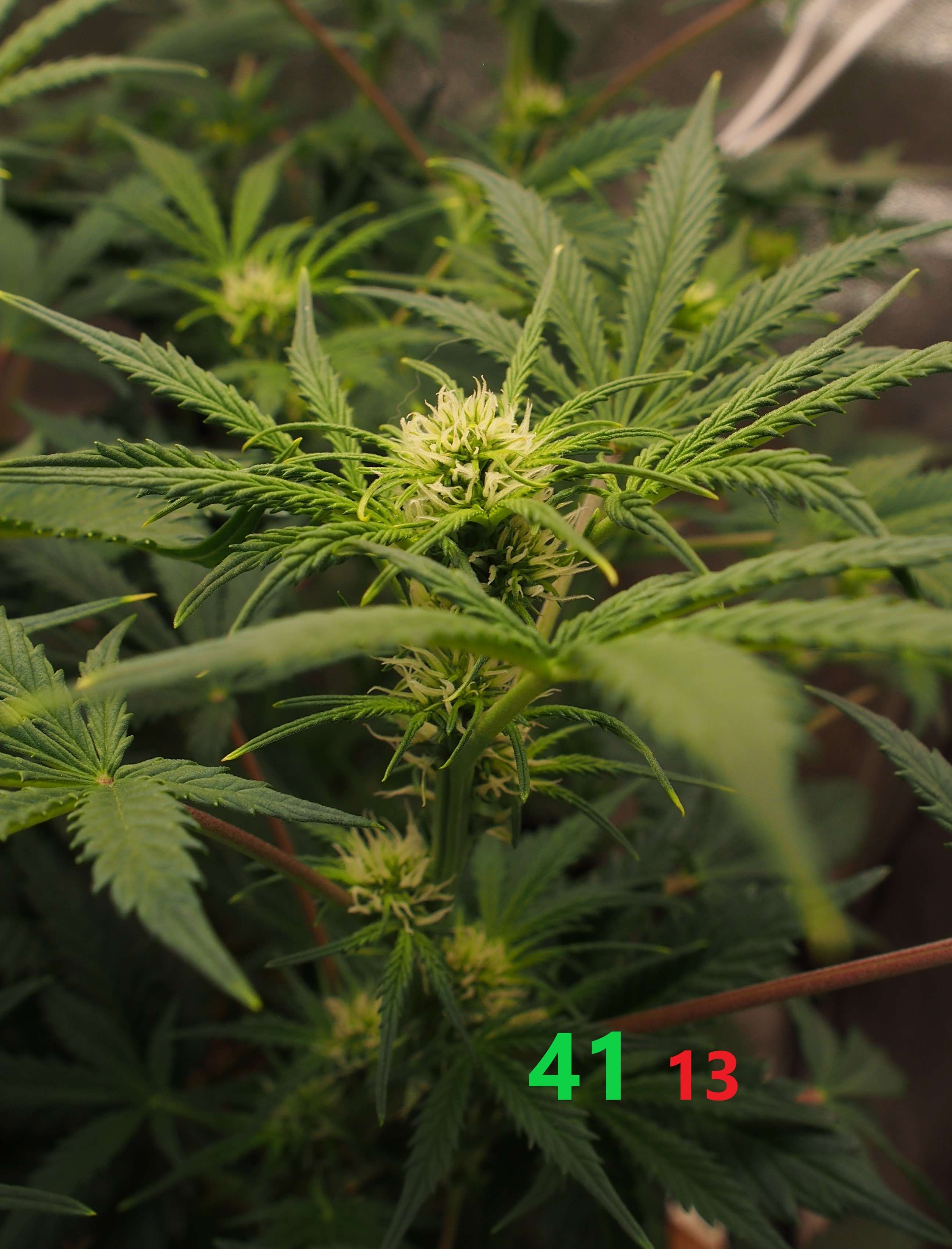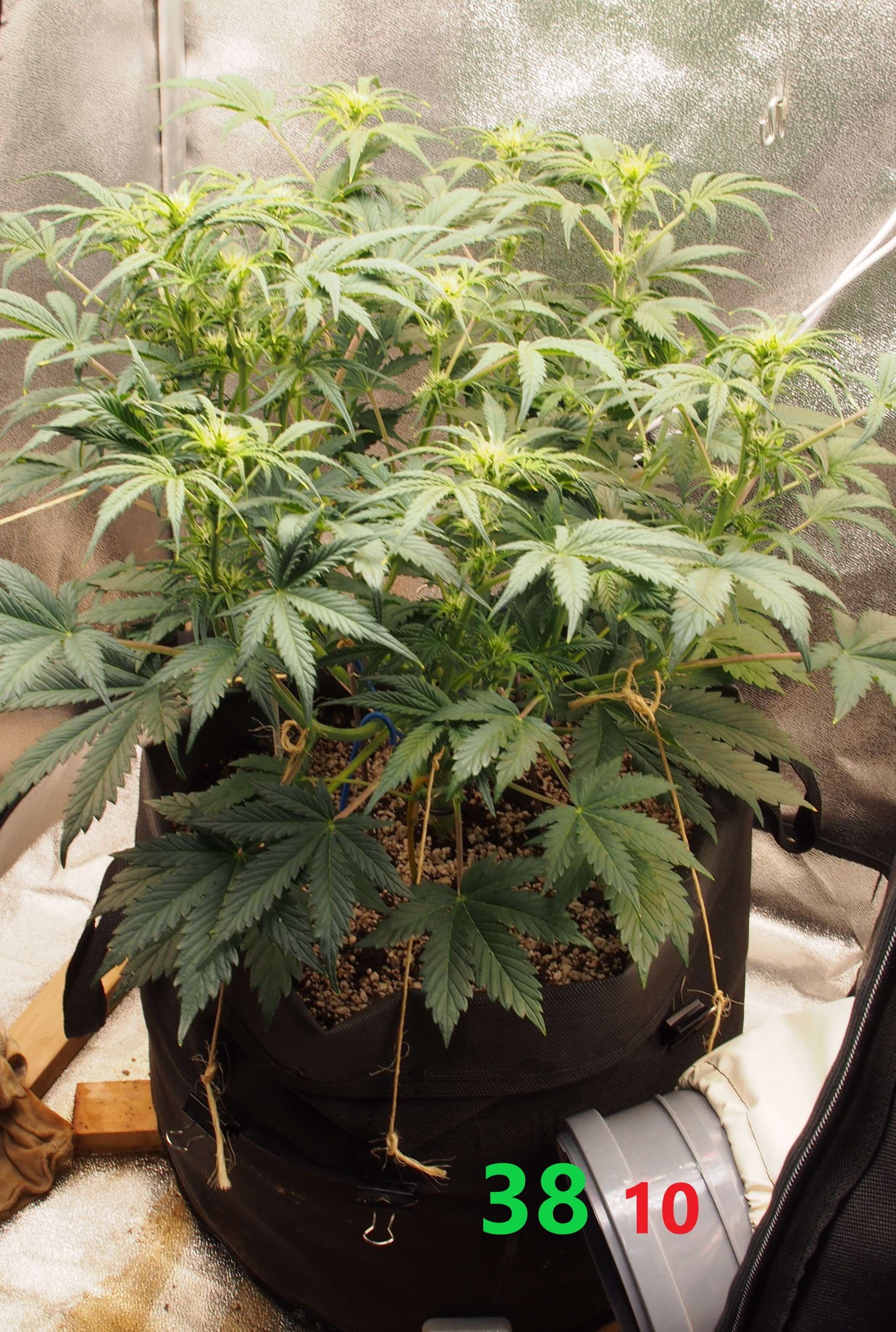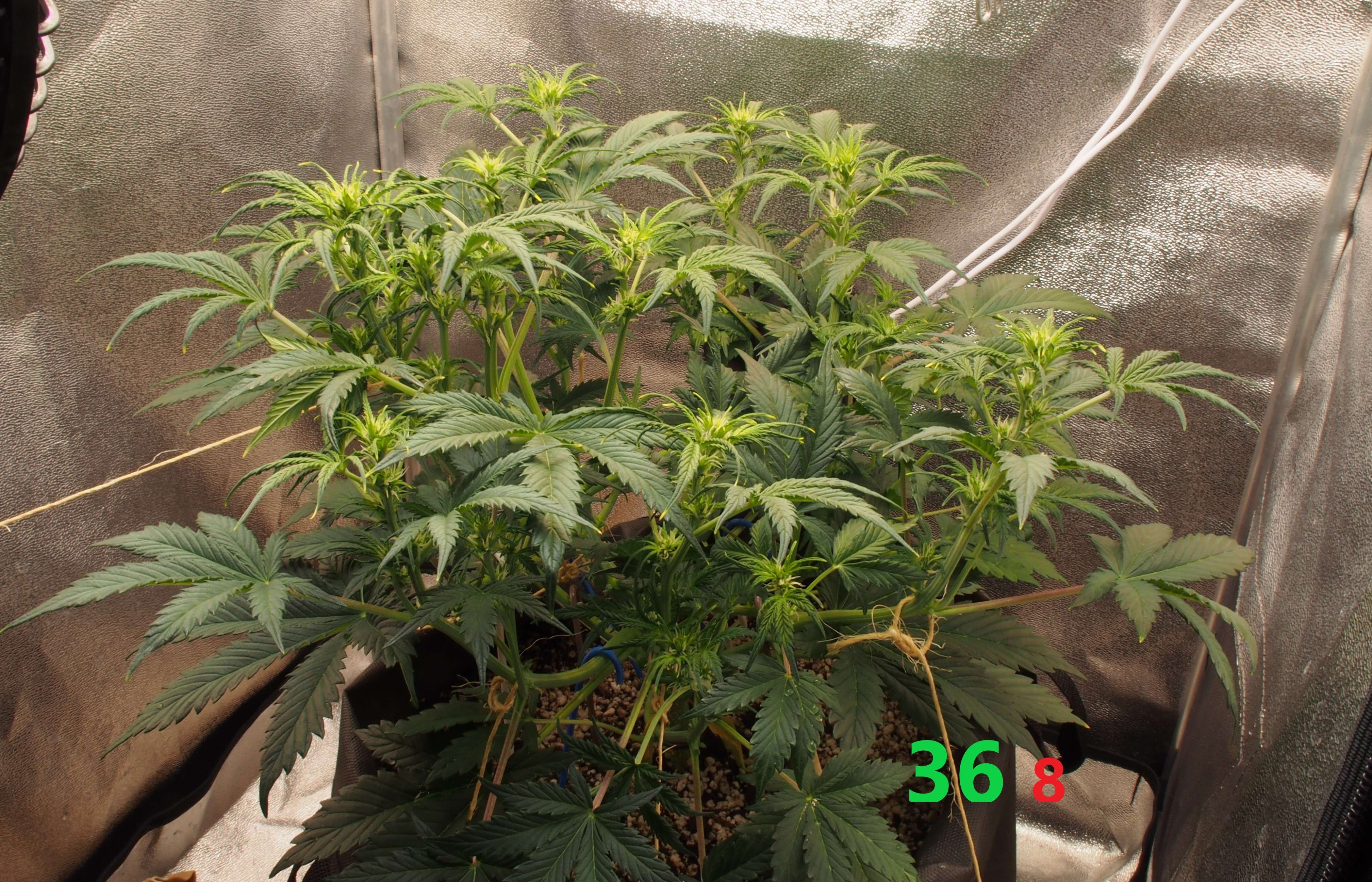 2-я неделя цвета. Растишка заметно выросла вверх - поэтому применяем только LST. Тянем главную колу вниз и стараемся создать несколько равных по уровню верхушек. Листьев много, но дефолиация минимальная - нет каких-то огромных лопухов, а резать кучу мелких листочков я не хочу.