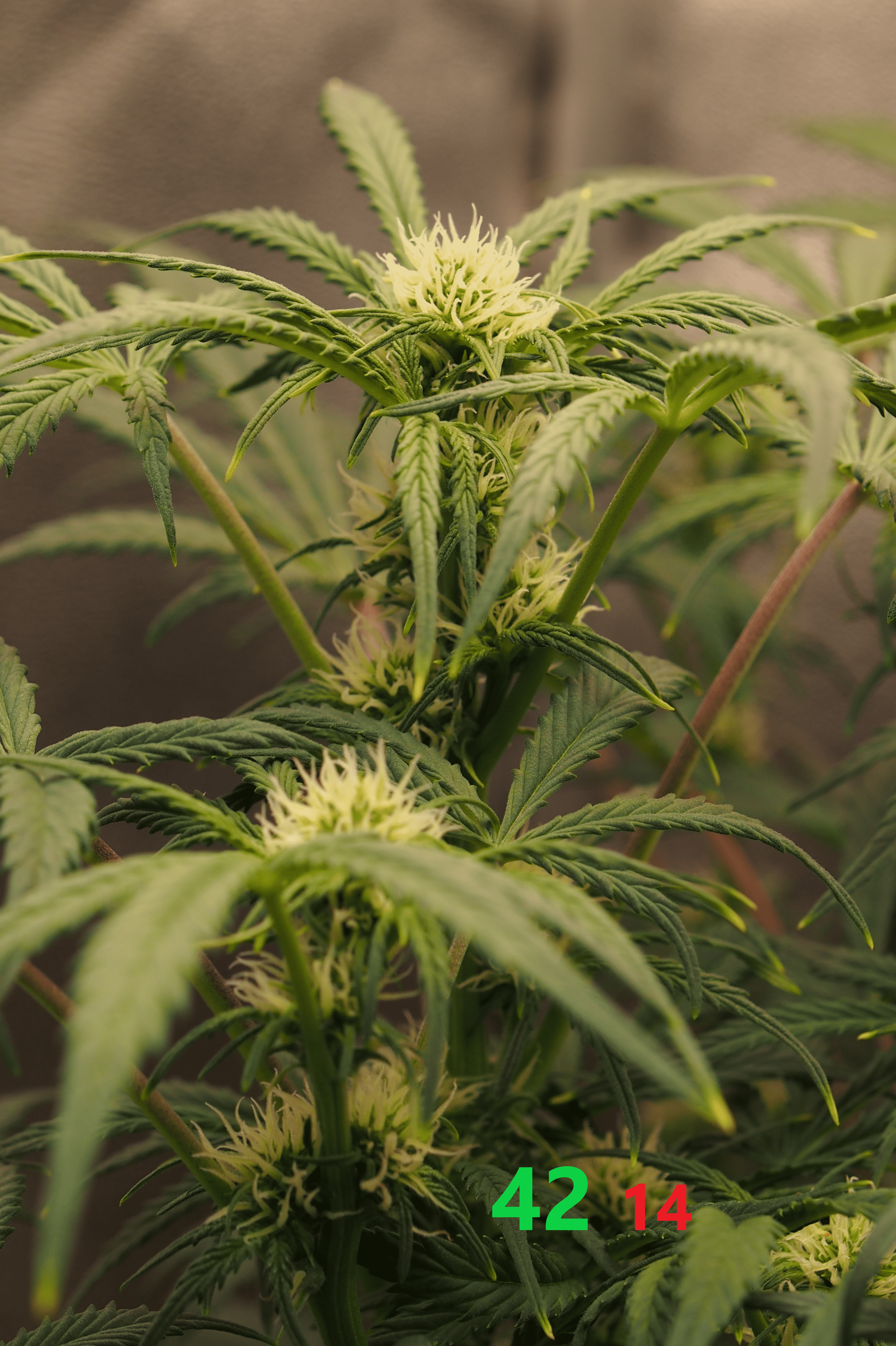 Свет - 50.000 lux. Высота растишки очень комфортная, низкая (70 см? даже не замерял.. но, лампы для меня висят очень низко). При этом куст растёт в ширину и фактически занимает уже весь бокс, поэтому не пытайтесь этот сорт селить с соседями в небольших боксах - результат вас не порадует.