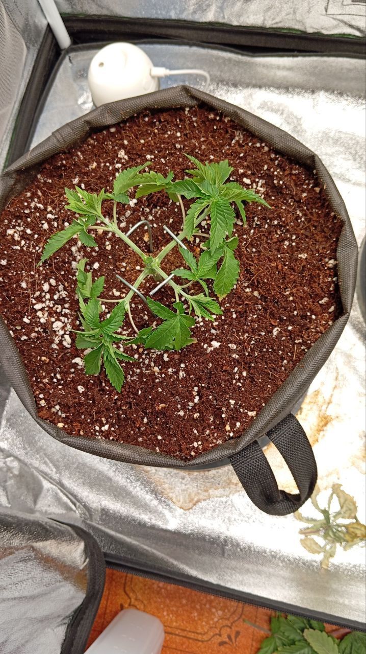 Растишка выздоровела и выглядит очень хорошо . За время ее "болезни " я ее не трогал . Под конец недели принимаю решение "настало время для тренировок" . За данный промежуток времени подросла хорошо . Первым делом делаю топпинг все что выше 3 этажа . Через пару дней боковые побеги окрепли и подросли начал их гнуть и делать мейнлинг . На следующий день удалил все первые узлы с побегов , тем самым дал больше воздушного пространства в будущем . Также были удалены все побеги которые смотрели в низ горшка ( они нам в будущем роли не сыграют , а энергию на свой рост тратить будут ).