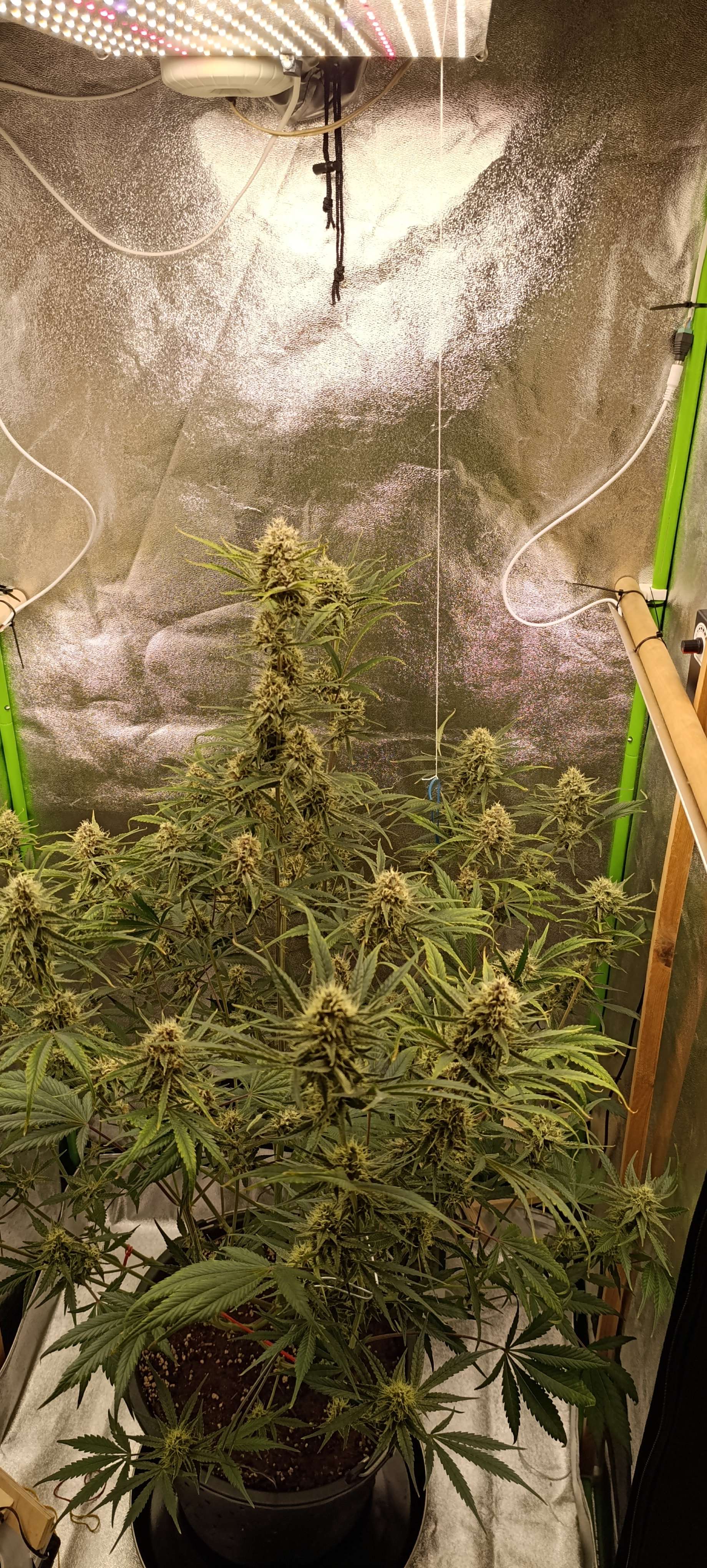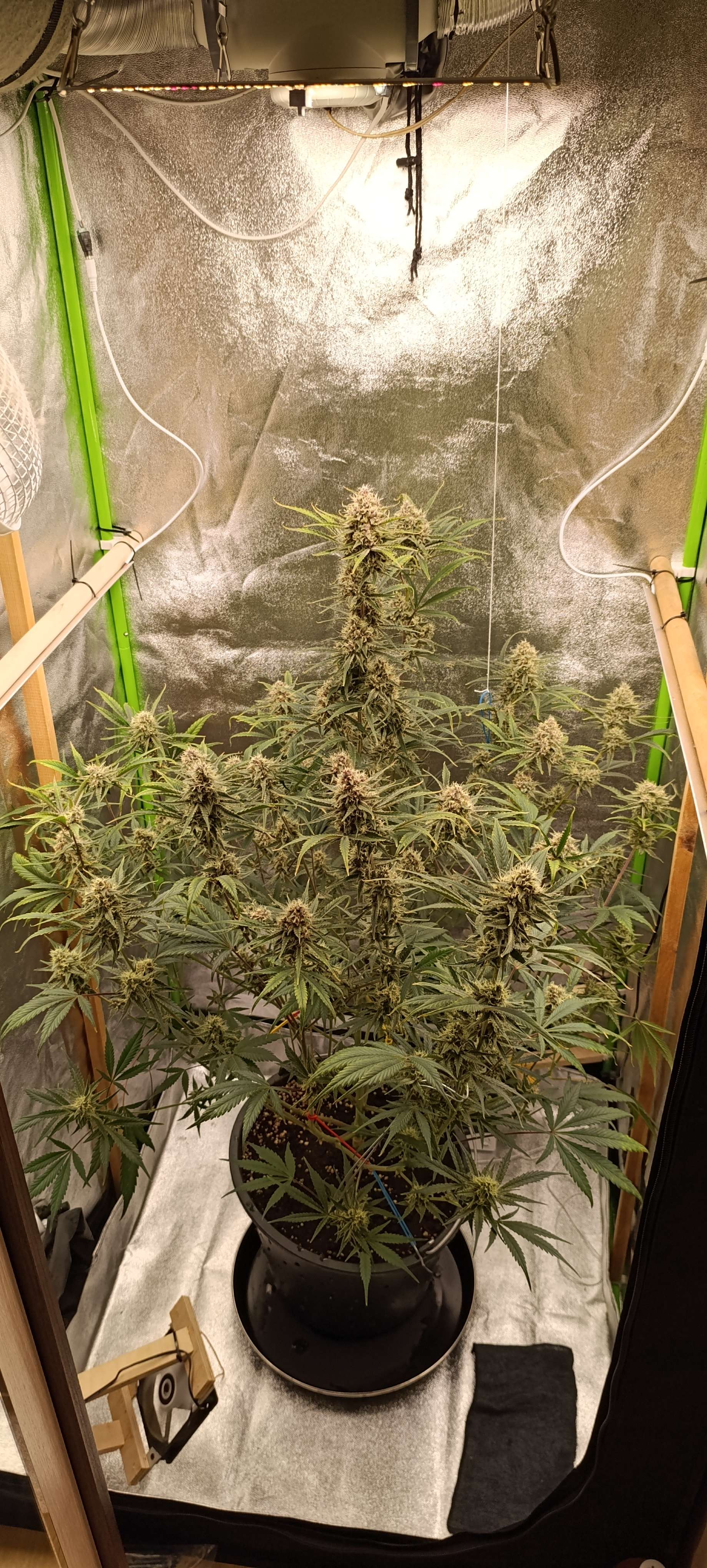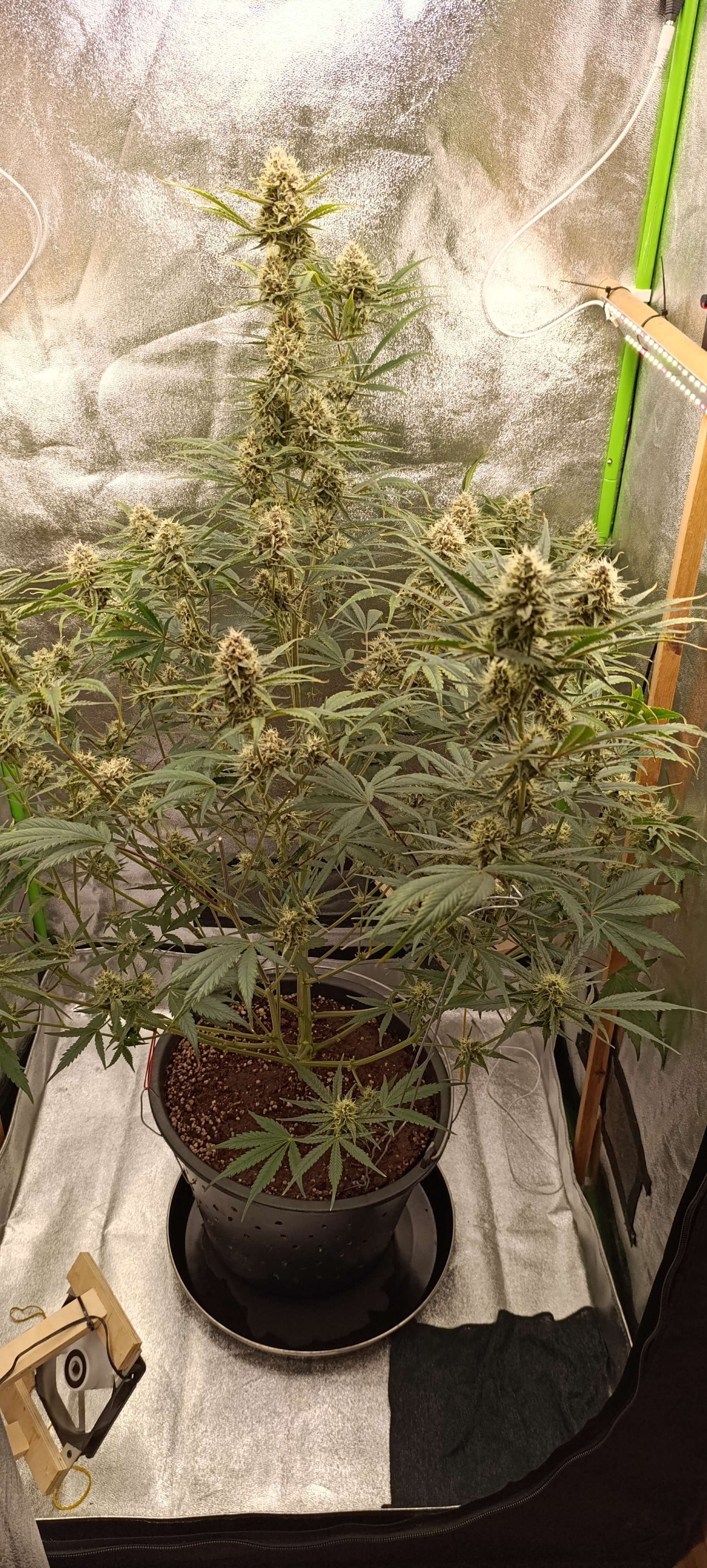 Шишки небольшие, но тяжёленькие. Две колы даже пришлось подвязать, как помидоры, а то душистая смолка оседает на стенке бокса)) Полив 5л компота, полив длится пару часов. Дренаж 0,5 литра, Ph 6,49. Свет 51000 Lux.