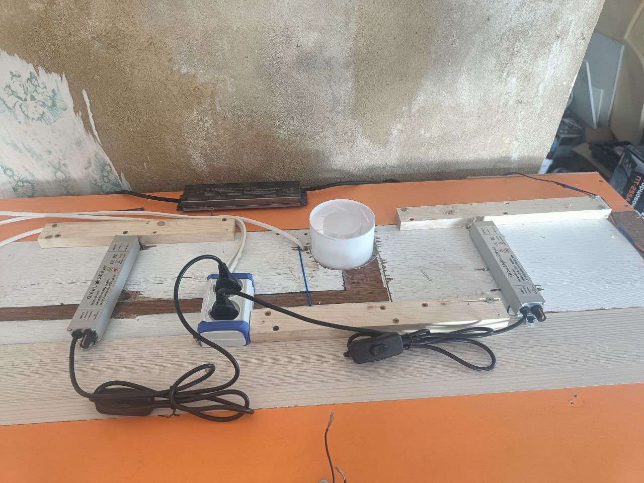 Всем доброго времени суток.Решил заняться,читал ,смотрел, форум чуть больше 3 недель, закал семки, 20.03 замочил в рюмке с 10 каплями перекиси 3% , через 2.5 дня дали корни , оба , посадил в горшки по 10л , предварительно пролил , и в шкаф, в темноту , шкаф собирал 2 дня , обклеил ,все проклеил алюминиевым скотчем,свет led полный спектр по 85вт 2 штуки диоды на Samsung 281+ вывел все оборудование наружу, установил вытяжной вентилятор на 95кубов,внизу кулер из блока питания с компа ,с этого же блока срезал провода и использовал ,для кулера 120мм ,на вход вентиляции снаружи прилепил угольный фильтр для кухонных вытяжке ,таймеры две штуки на свет и вентиляцию,заказал термометр для регуляции вентиляции и пару удобрений, ghe пробники плюс отдельно докупил micro sw,ph down , водой пролил кипячёной,сделал домик для датчика гигрометра