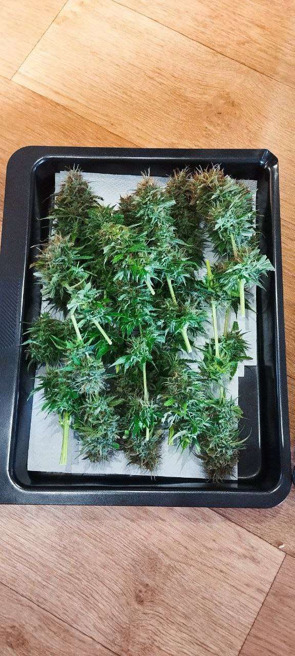 Харвест был начат для АК 47 преждевременно, раньше на 2 недели, в связи с появлением плесени на центральной коле, половина колы была удалена и выброшена сразу, после пришлось удалить и оставшуюся часть центральной колы. По этой причине было принято решение сушить не кустом, а отдельными веточками, дабы предотвратить распространение на другие колы, в случае её появления. 02.09.25 Ак 47 был срублен и помещён в бокс на просушку, просушка закончена 06.09 вес сухого урожая составил 63.5 грамм соответственно вес мокрого урожая примерно в 4 раза больше, опять же нужно учитывать что на мокром урожае, присутствуют ветки или сам куст со стеблем, которые на сухом отделяются. Сегодня вечером урожай АК будет помещен в стеклянные банки в холодильник, для пролечки ...