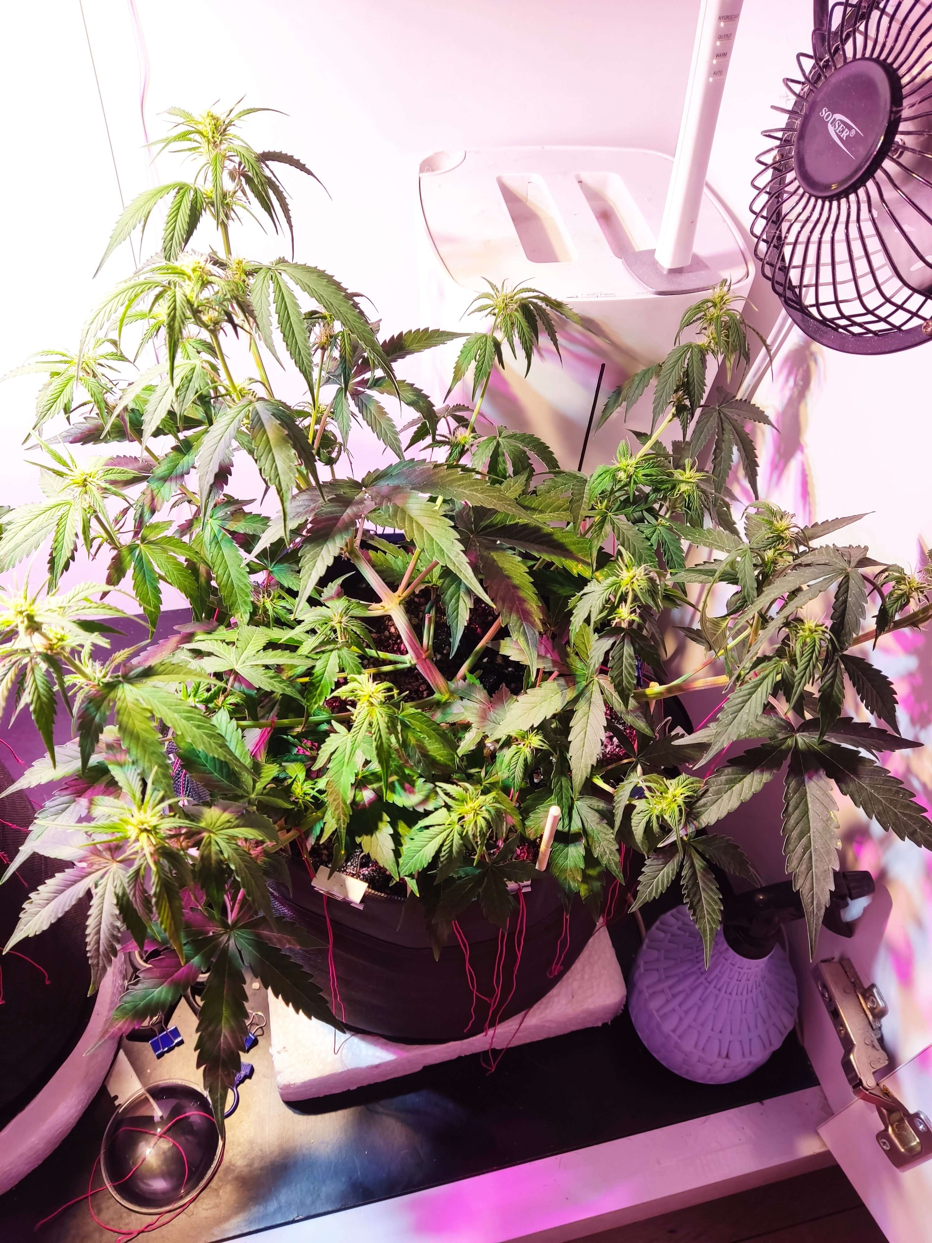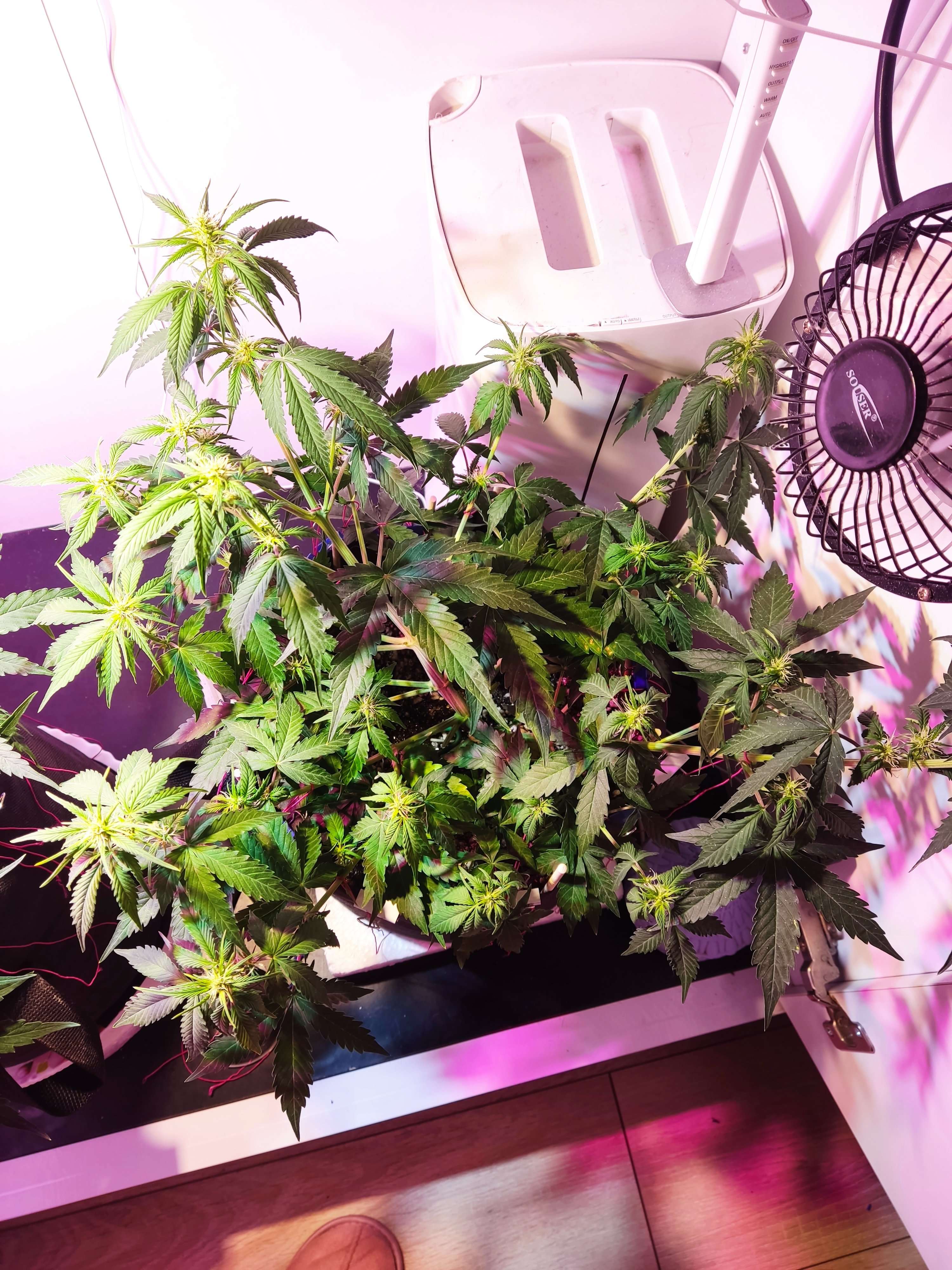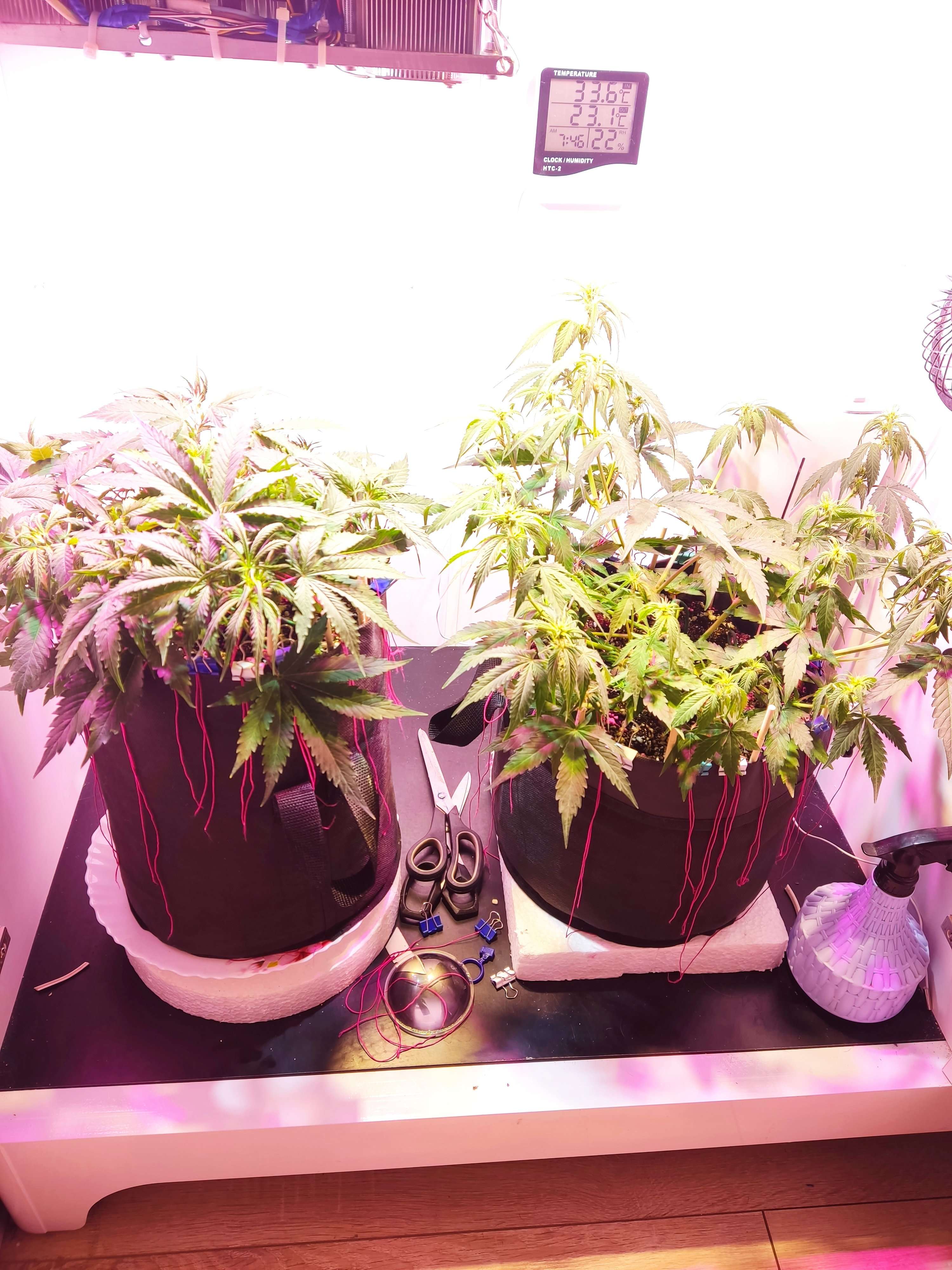 Ну вот так девчонки выглядят к концу 5 недели, к концу 4 недели pink начала цвести. Sexy пока активна набирает листву, ну в росте мне кажется отстаёт. Сегодня повесили вторую лампу . 3 матрицы в общей сумме на 130 ватт. Итого 260 ватт на 2 Растишки. Много пролила до дренажа компотом от био биз. Гров и Блум по таблице. На выходе 0,5 литра из дренажа. Ph ровный 6,6 ппм около 220. Залито было в районе 600. Пока как то так
