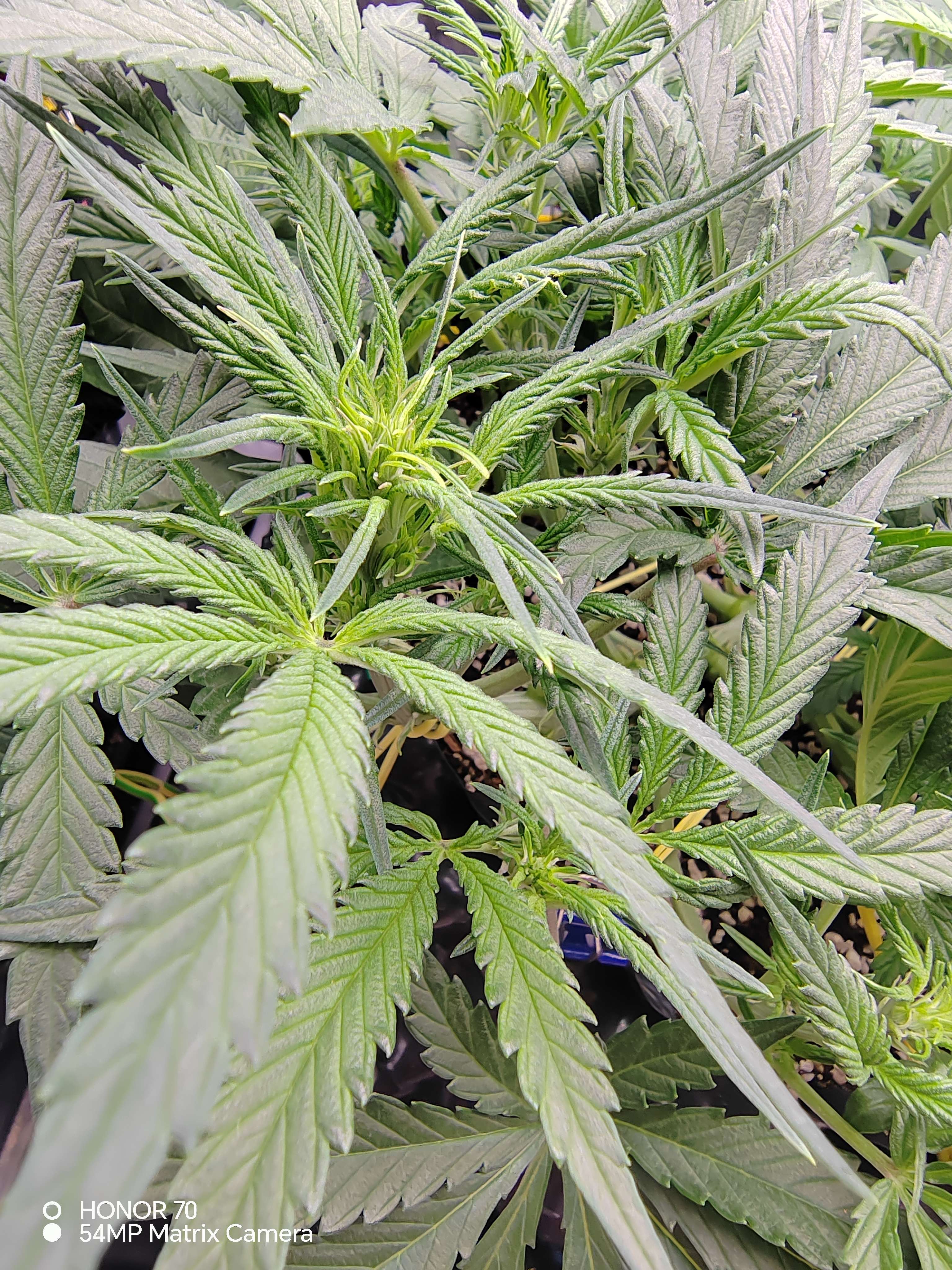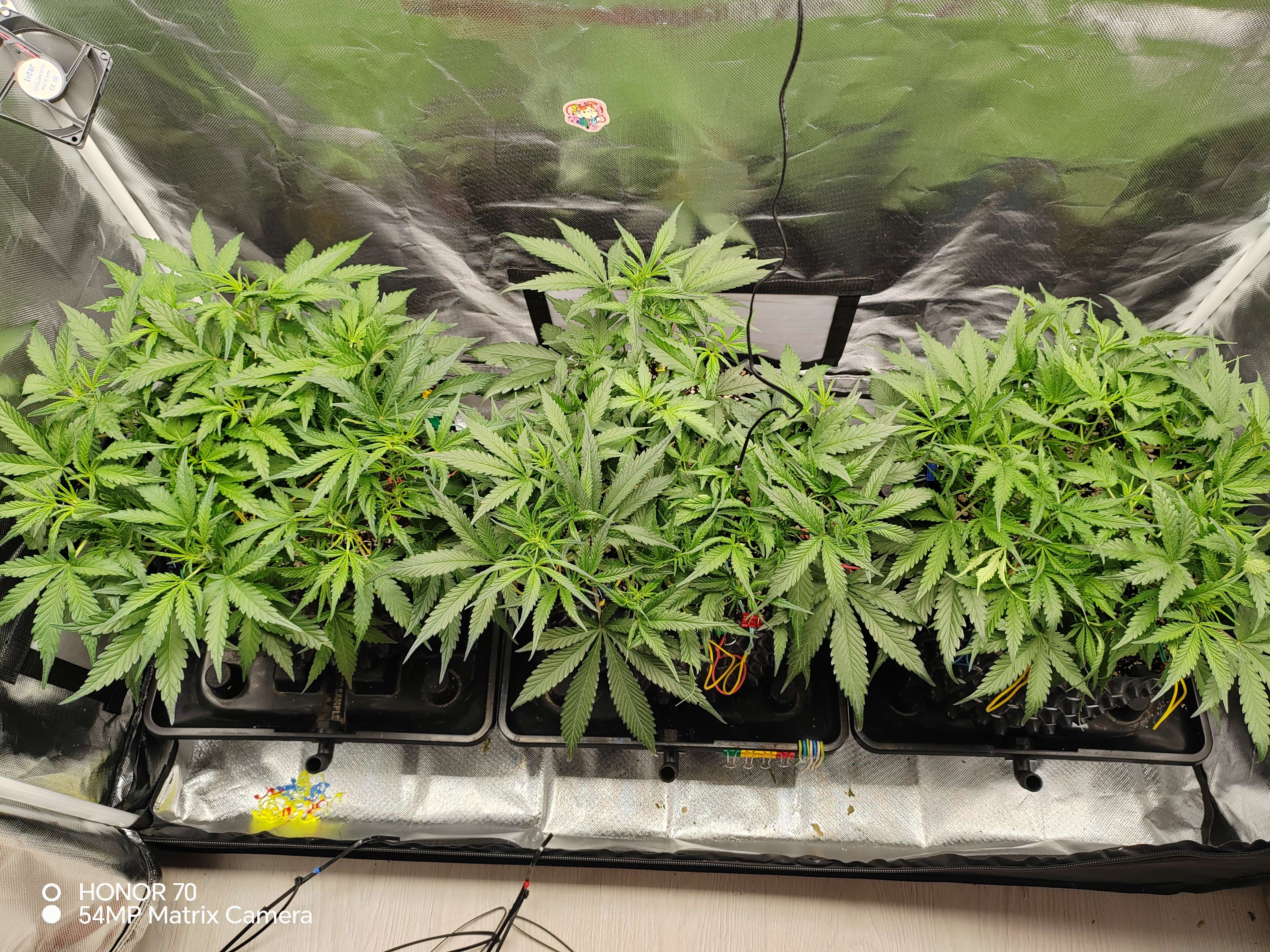 Продолжаю понемногу подгибать, так же приходится потихоньку обстригать ботву, ее реально очень много... Появился запах, как мне кажется проскальзывают какие то кофейные нотки. В целом, на мой неопытный глаз, все идет нормально. Единственный момент это начал поднимать ppm,так как ростихи недоедали. Судя по показаниям дренажа. Дэфоф пока небыло, но не буду до этого доводить, так что потихоньку продолжаю наваливать базы в компот.по старой схеме, каждый третий полив, сначала вода с калмагом до 200ppm,и выровненым ph 5,8 по 3,5 литра каждой. Затем по 3,5 литра компота🤷как то так...