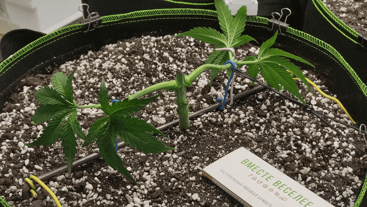 На этой неделе, на 19й день (он на неделю отстает от Брюса), топнул растиху, обрезал лишние (имхо) листья и пригнул боковые колы. Топнул 7й этаж.