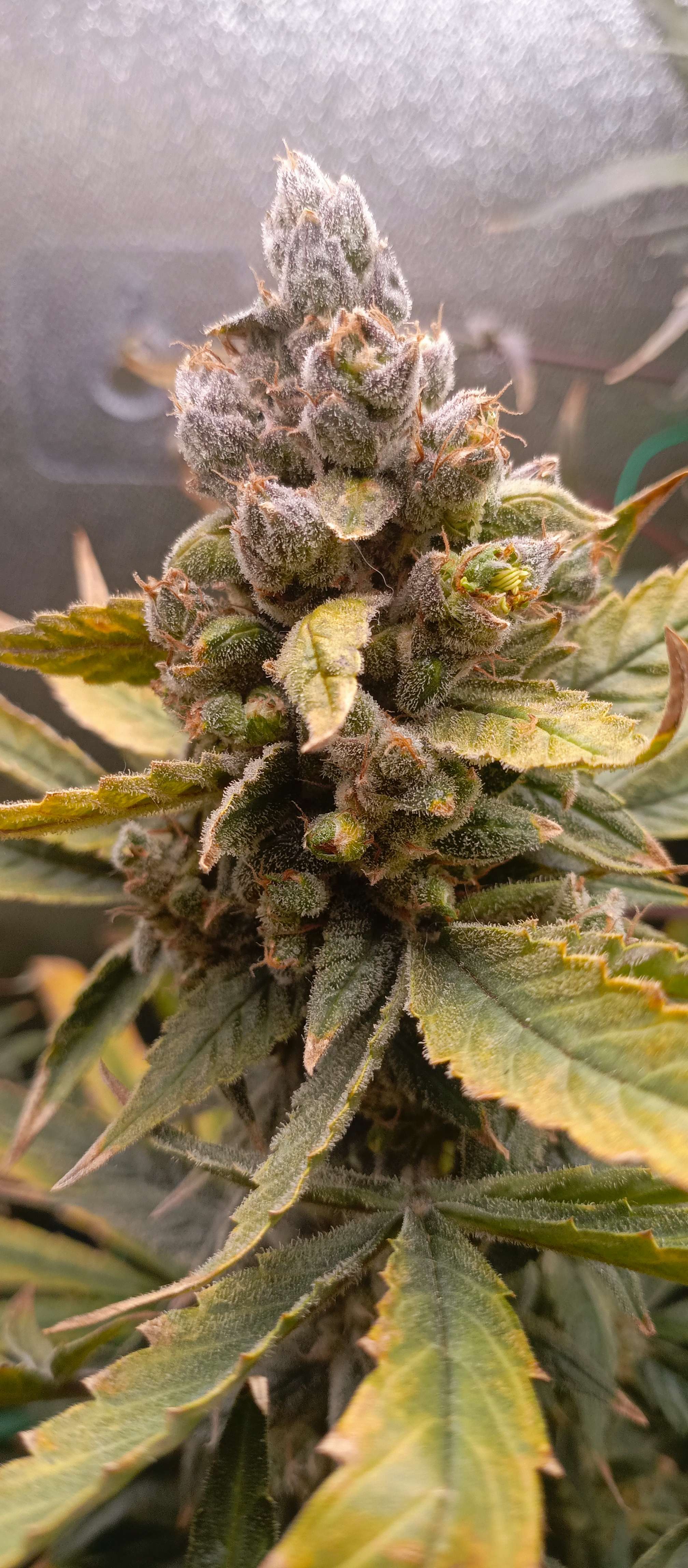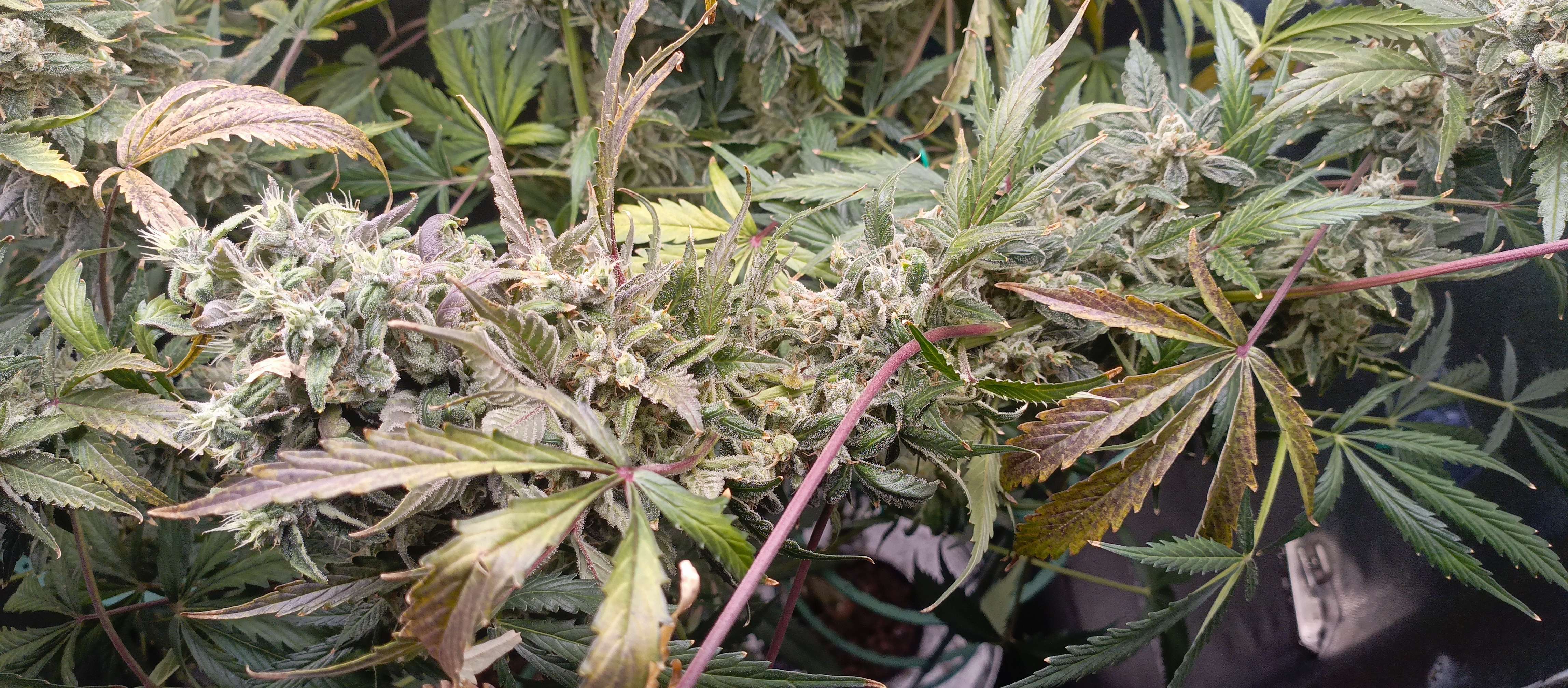 Я бы подержал кустик ещё дней 7.. стигмы на верхних колах прям активно растут - шишки ещё набирают мощь (но, это на месте гроверу видней.) Если гнёт - то подвяжи куст верёвочками.. А вот что бы я точно сделал - удалил лопухи, особенно которые поражены дефицитом. Смысл их держать если это финал грова? Они, между прочим, сейчас забирают на себя дефицитные силы растишки - срезать их безжалостно!