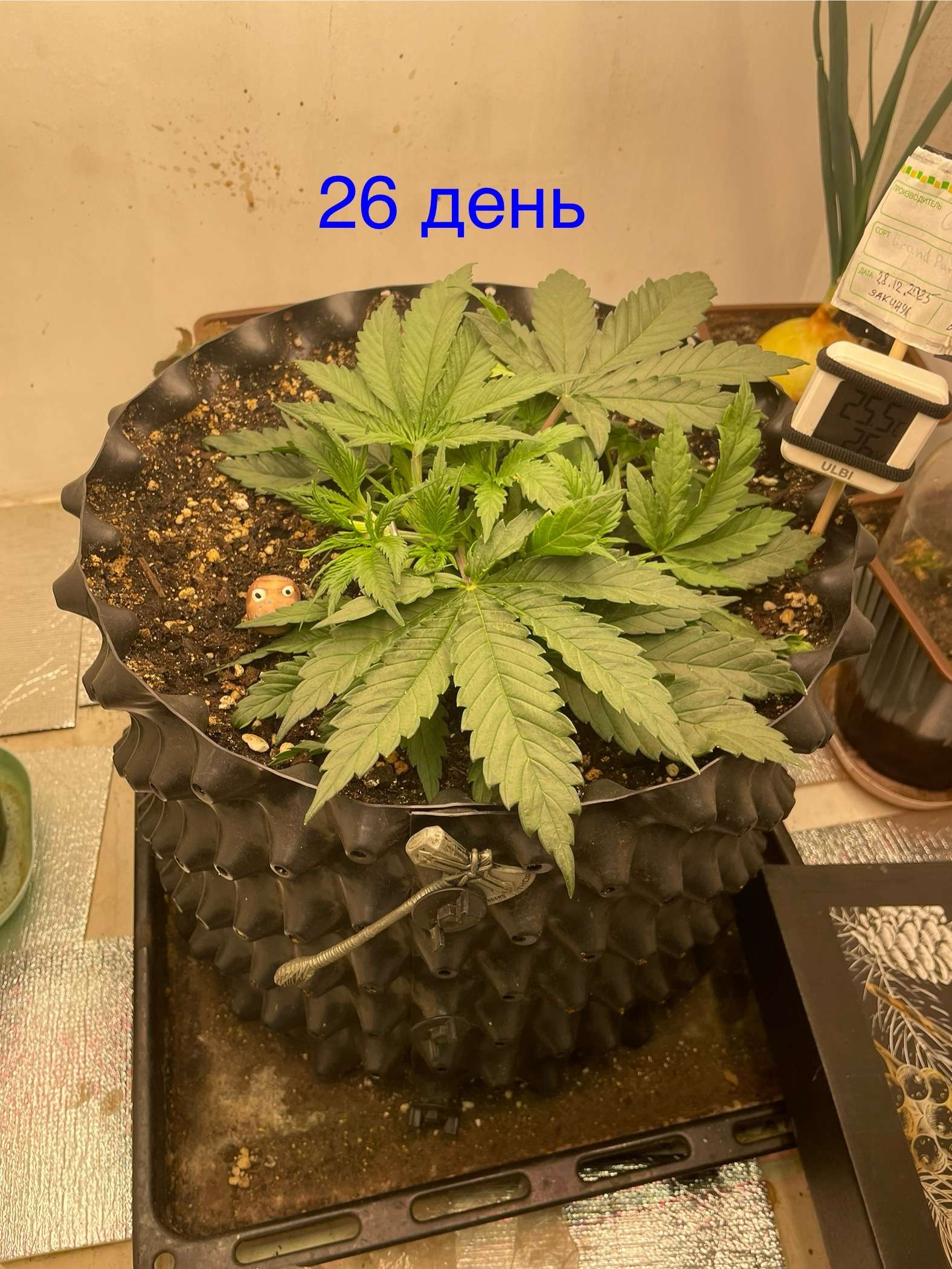 Так что могу сказать вчерашний полив был лишний и я отломал листок нечайно, куст уже издает запахи думаю этот гров без фильтра не обойтись, немного уныла девочка, но нечего, пришла разетка с термостатом настроил на 20-28 градусов будем наблюдать…