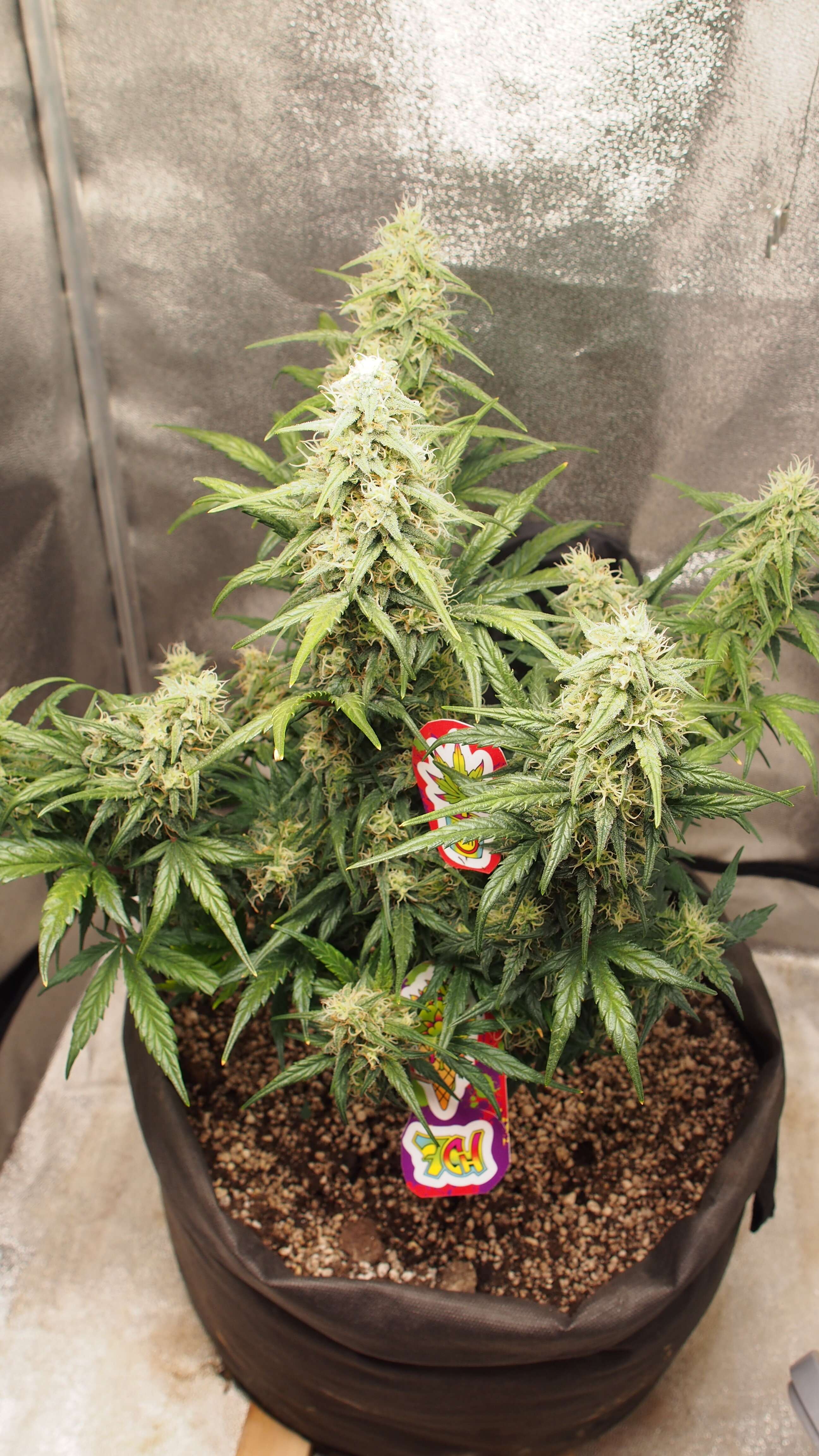 Я могу констатировать, что то, что получилось на сегодняшний день, это отличный кандидат на стелс-гровинг или микрогровинг.Все условия тут соблюдаются: очень короткие сроки веги/цветения, высота до 40 см, очень слабый запах (практически нет на сегодняшний момент), очень крепкие стебли и сплошные плотные соцветия. Запах - он практически отсутствует на текущий момент, едва уловимый привкус лимона. НО, если вы потрагаете руками ветки или соцветия, то тут же все наполняется запахом лимона, скунса, фруктов, мармелада. Все пальцы становятся липкими - т.е. формирование трихом и смолы идёт полноценно.