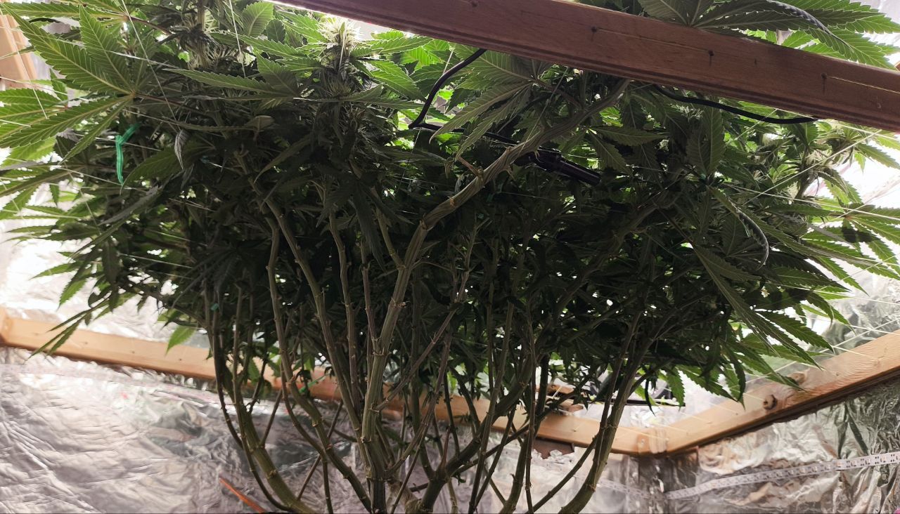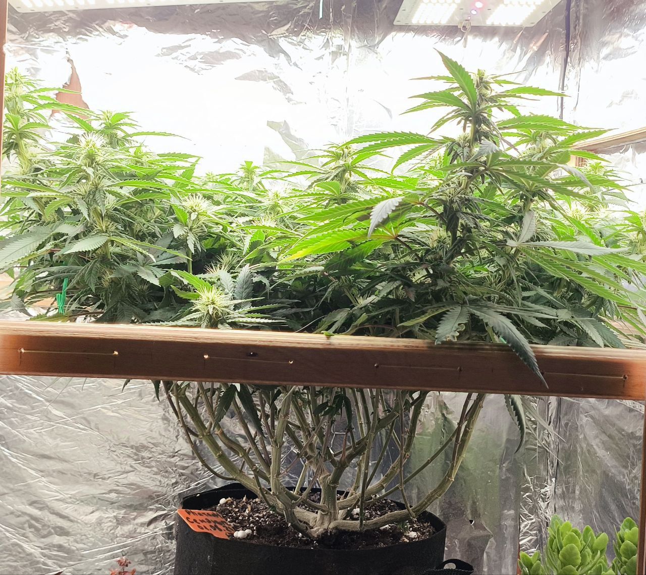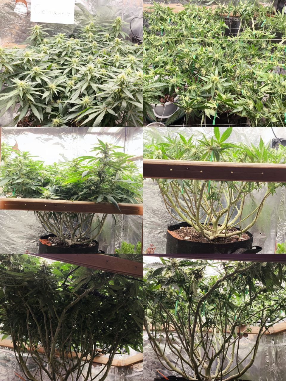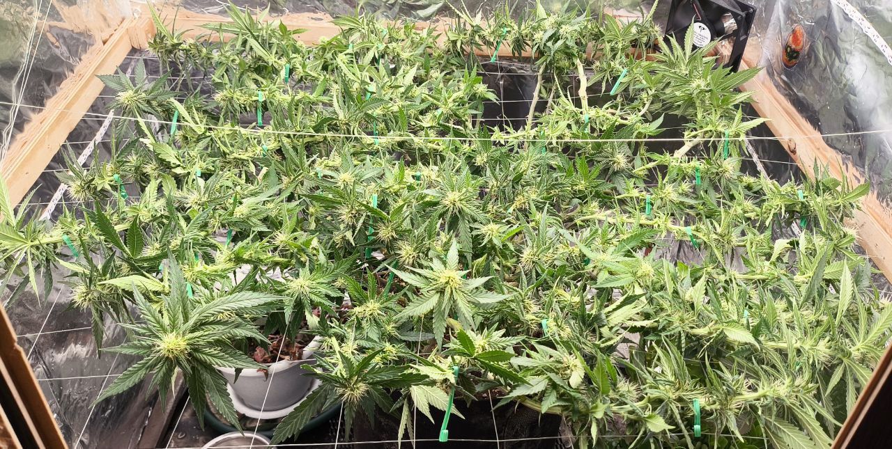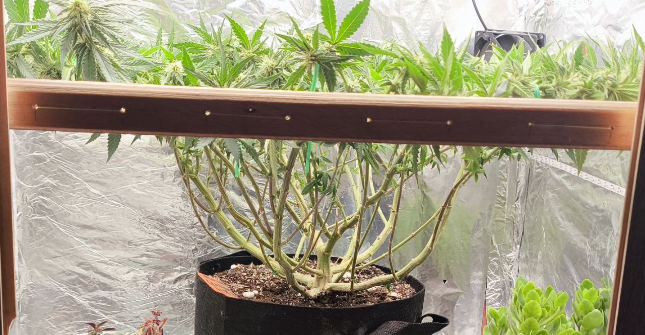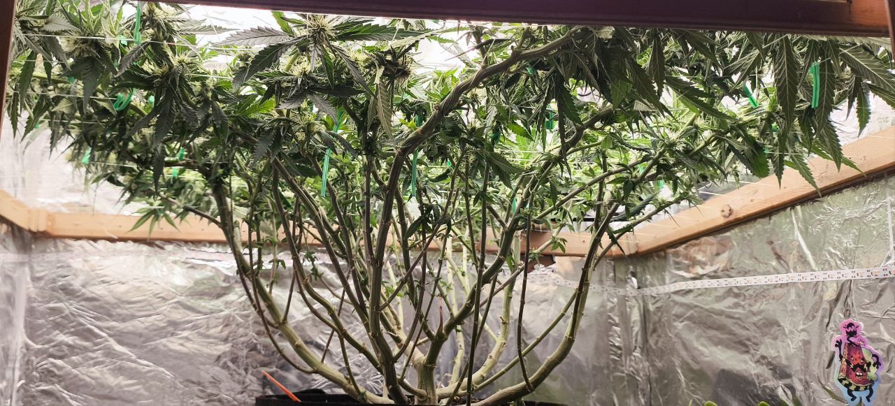Чтож, очередная экстремальная дефолиация по таймингу Швази. :prayУдалены все крупные веерные листья, частично сахарные лопухи. Произведена растяжка в горизонтальной плоскости, для лучшего доступа света к соцветиям:growbox